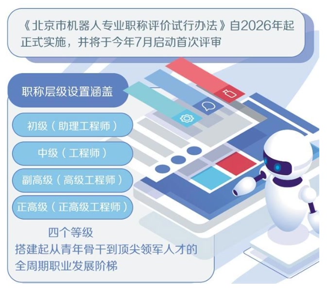 近日,北京市人力资源和社会保障局正式印发《北京市机器人专业职称评价试行办法》,在工程技术系列增设机器人职称评审专业,精准匹配机器人领域人才评价需求,助力北京打造机器人产业创新发展新高地。该办法自2026年起正式实施,并将于今年7月启动首次评审。