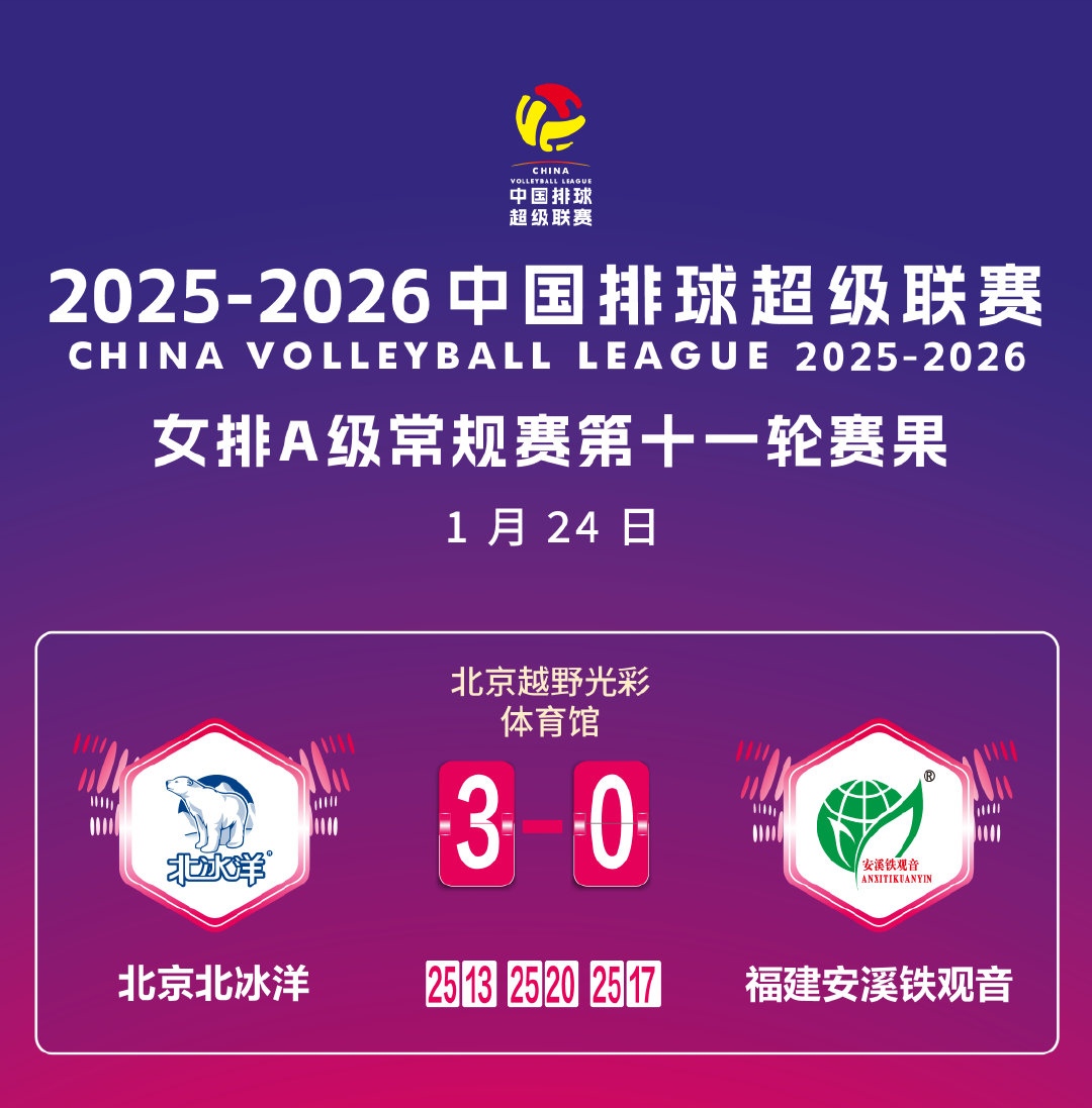 1月24日,中国排球超级联赛女子常规赛A级第11轮,北京北冰洋女排主场3比0战胜福建女排。拿下这场胜利后,北京女排继续暂列排名榜前四。