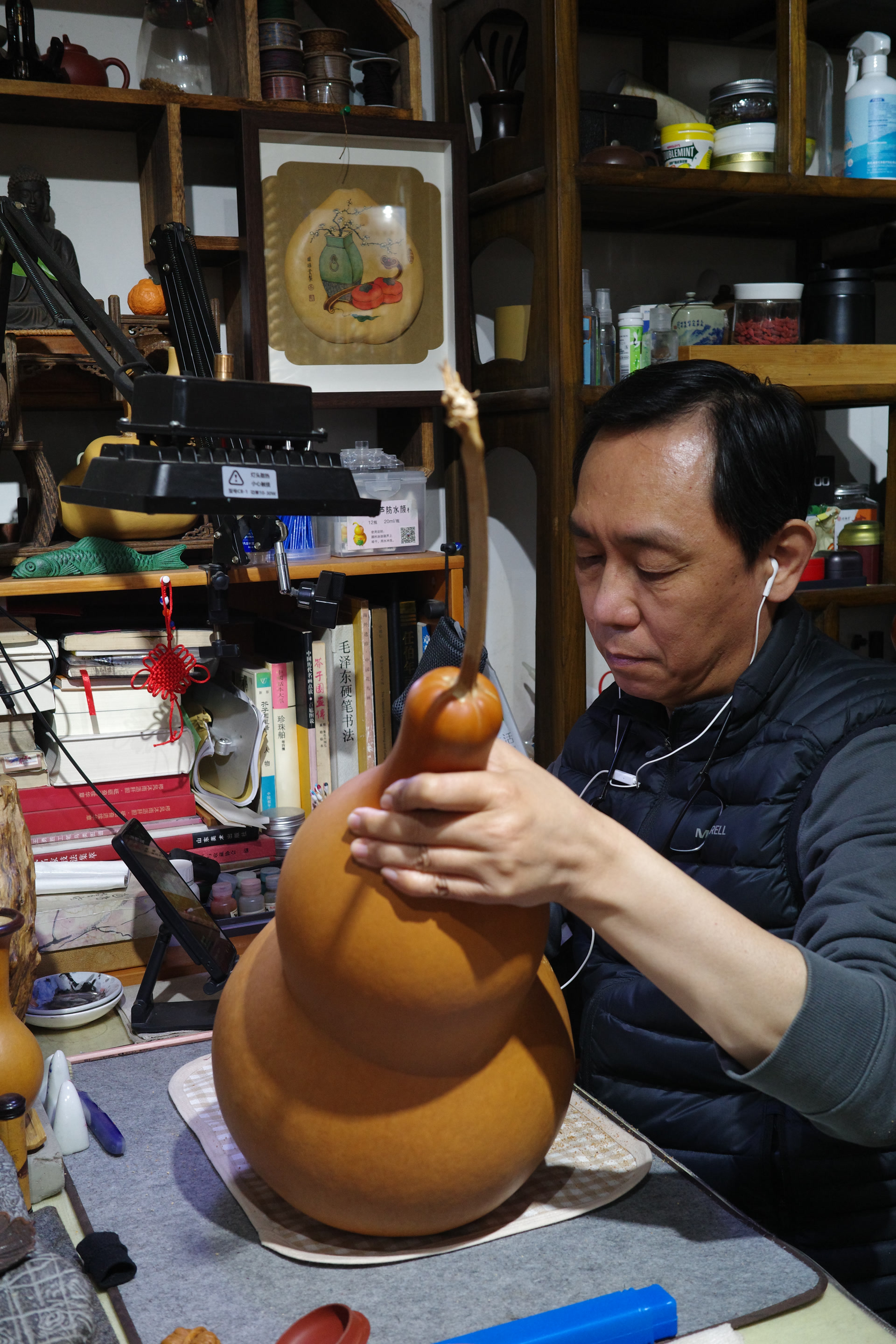 近年,他用有纹饰的葫芦制成葫芦音箱,小巧便捷。