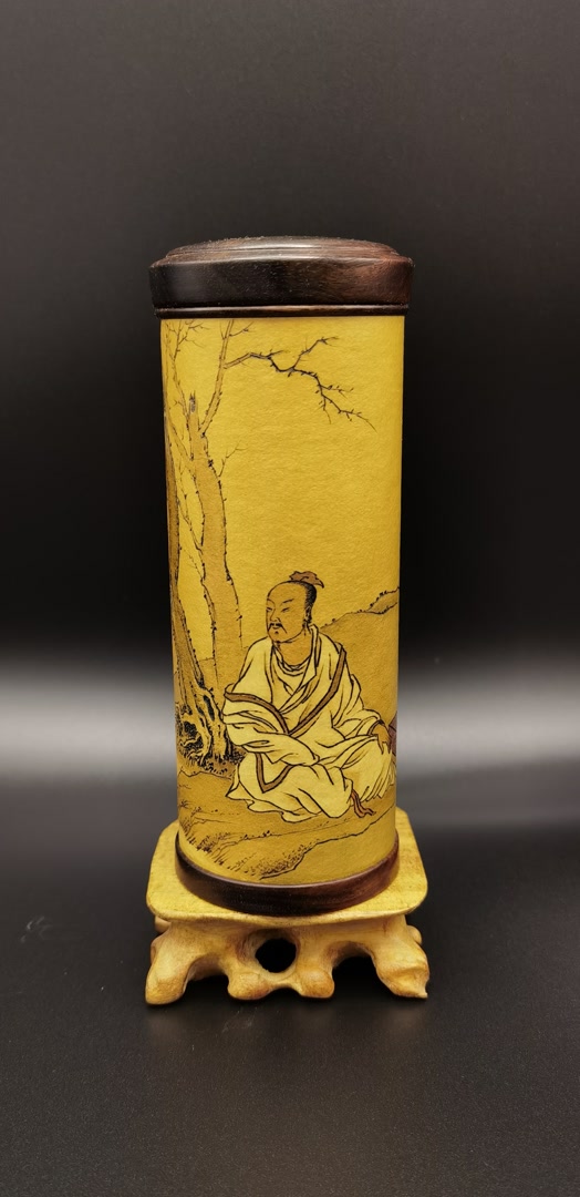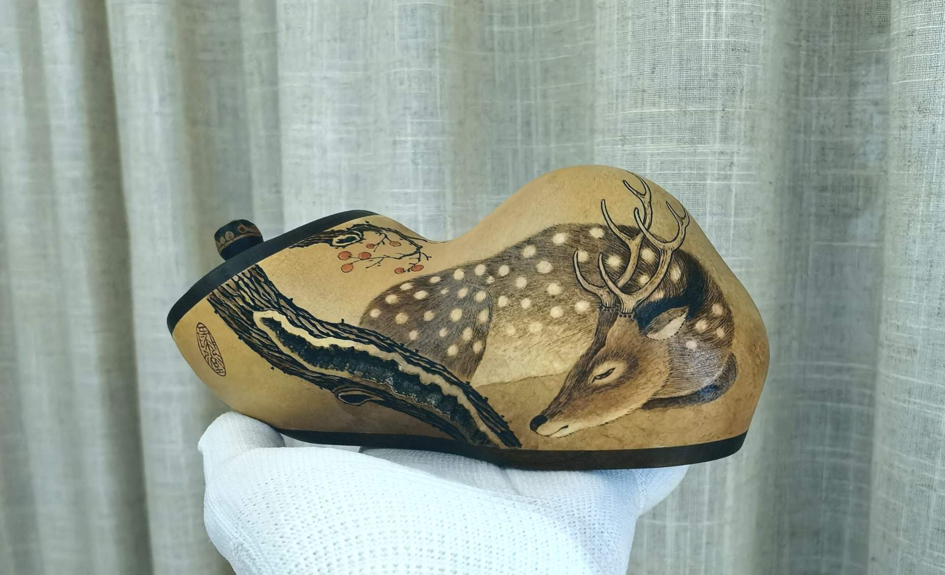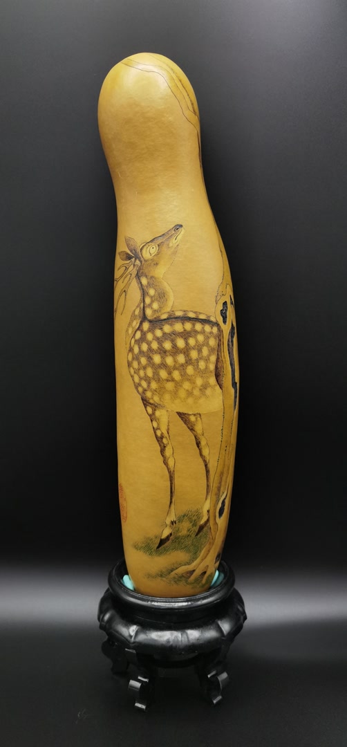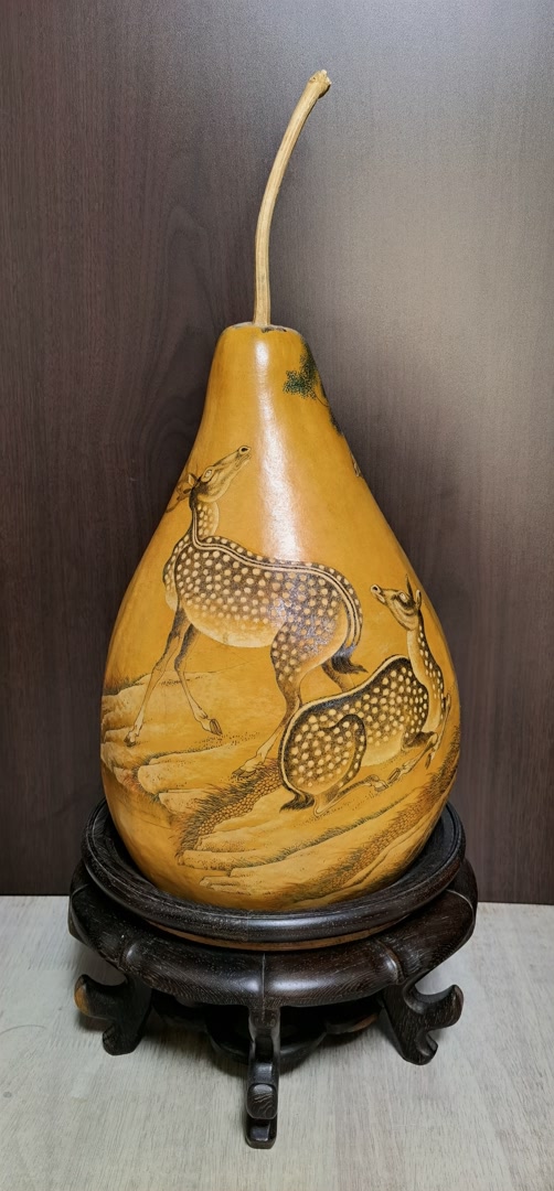 高翔雕绘的葫芦随型布局,并不追求满片;葫芦器型的选择也很讲究,纹饰多为古代名画的局部,择图时多会考虑与葫芦相契合的纹饰,如鹿、清供图、高士图等。