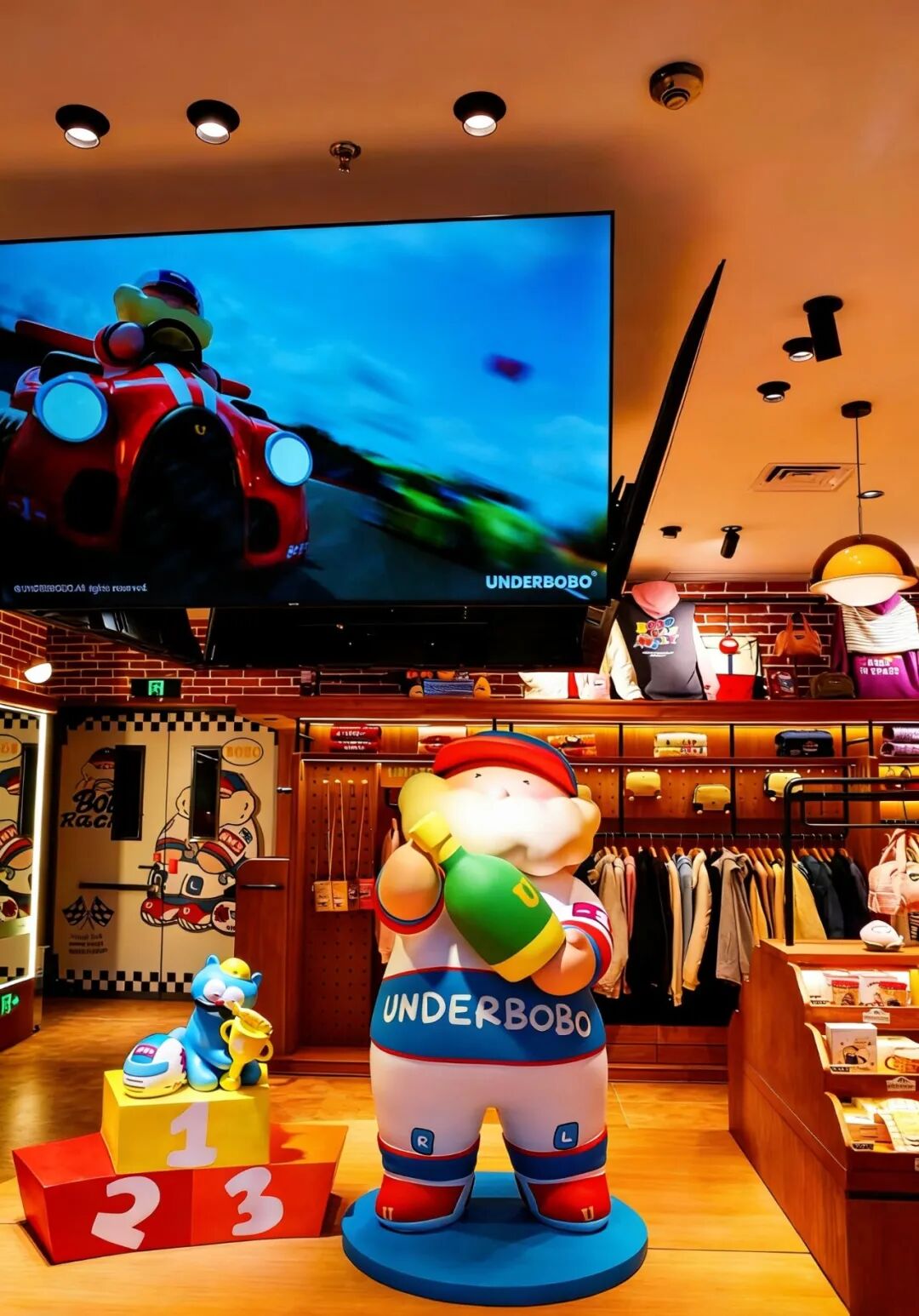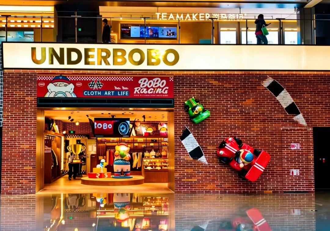 UNDERBOBO全国首家赛车概念店携北京限定款亮相更新场,将其标志性IP——慈祥的退休英国绅士BOBO与他相伴左右的猫咪BOZO温暖冒险的故事,延伸至线下沉浸式体验空间。此次新店不仅延续品牌一贯的治愈美学,更通过赛道竞速主题场景,传递陪伴、共享与温暖的生活哲学。店内通过主题插画、赛车元素陈设及互动装置,将这段充满动感与情感的故事转化为可触、可感的线下叙事。