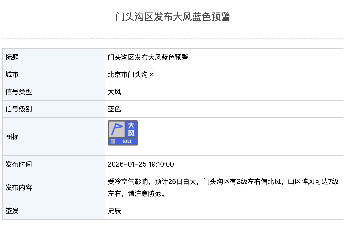 受冷空气影响,预计26日白天,门头沟区有3级左右偏北风,山区阵风可达7级左右,请注意防范。