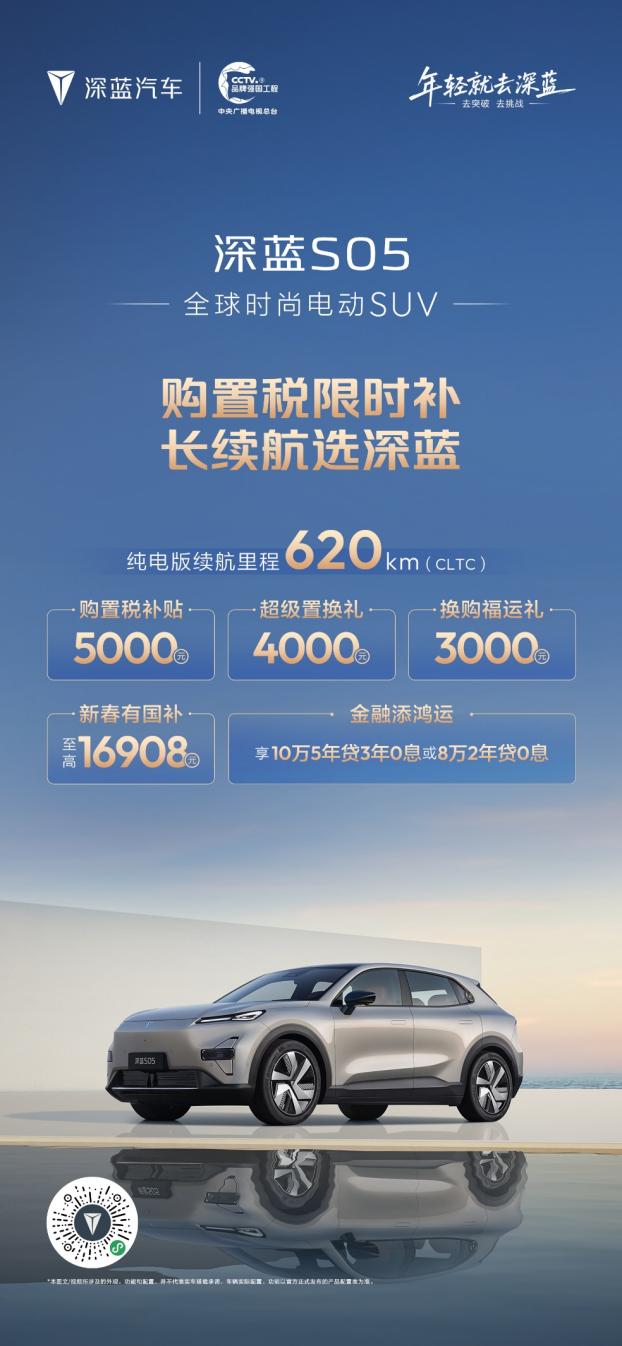 现在下订深蓝S05,可享5000元购置税补贴、4000元超级置换礼、3000元换购福运礼、至高16908元新春国补,金融方案同样提供10万元5年贷3年0息或8万元2年贷0息选择。