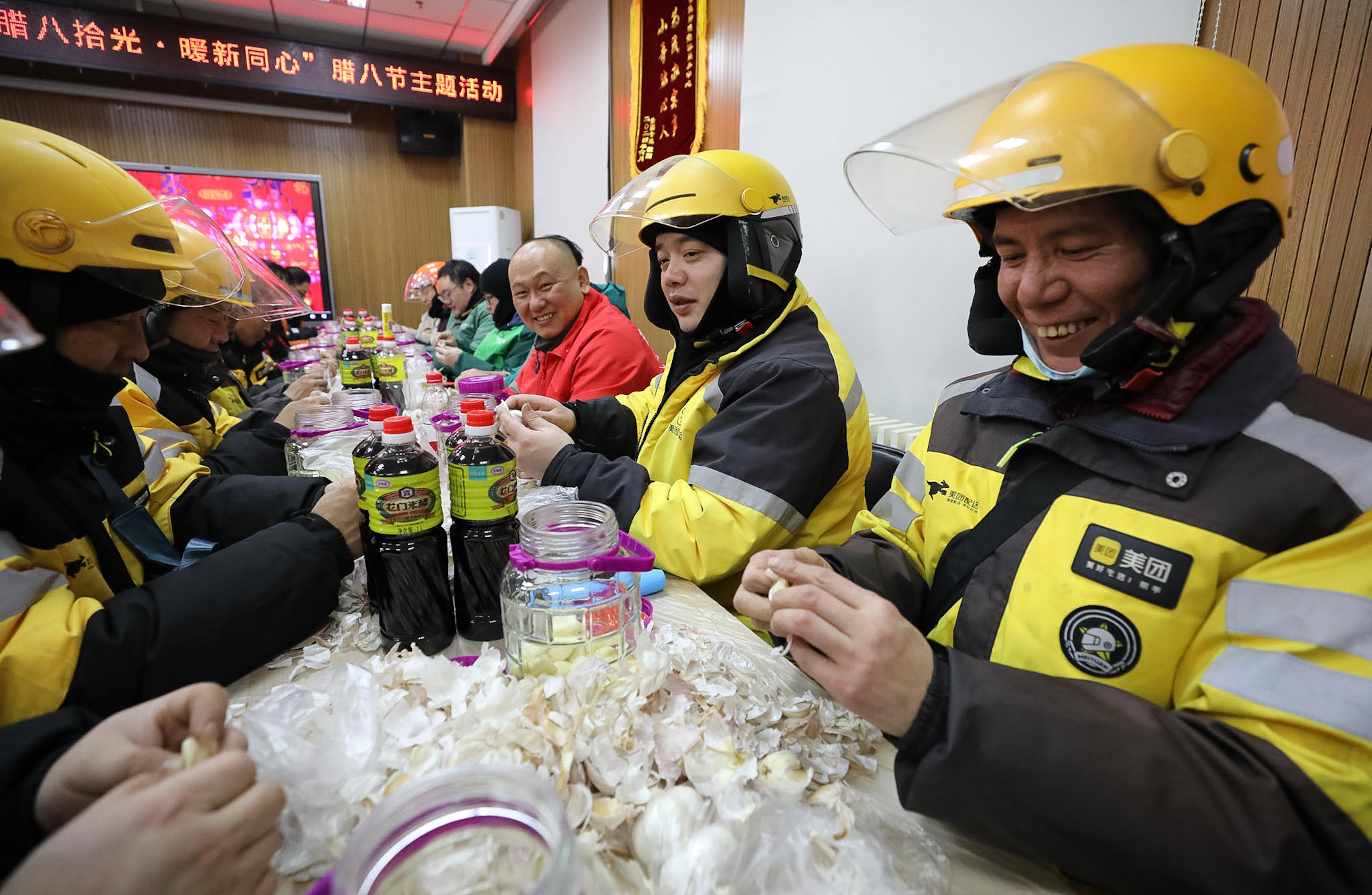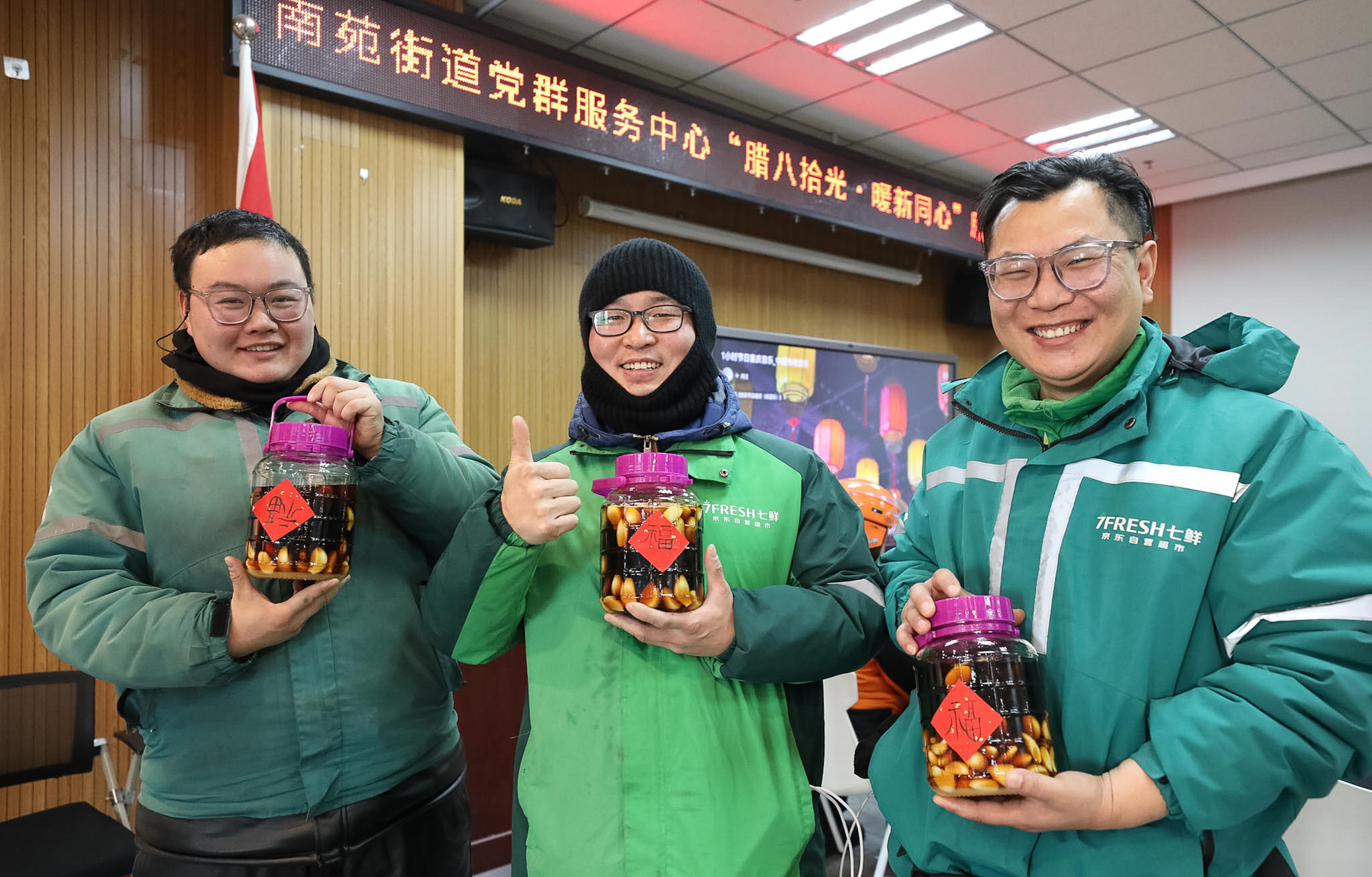 1月26日,丰台区南苑街道党群服务中心举办腊八节活动,邀请外卖员、快递小哥等新就业群体参与。