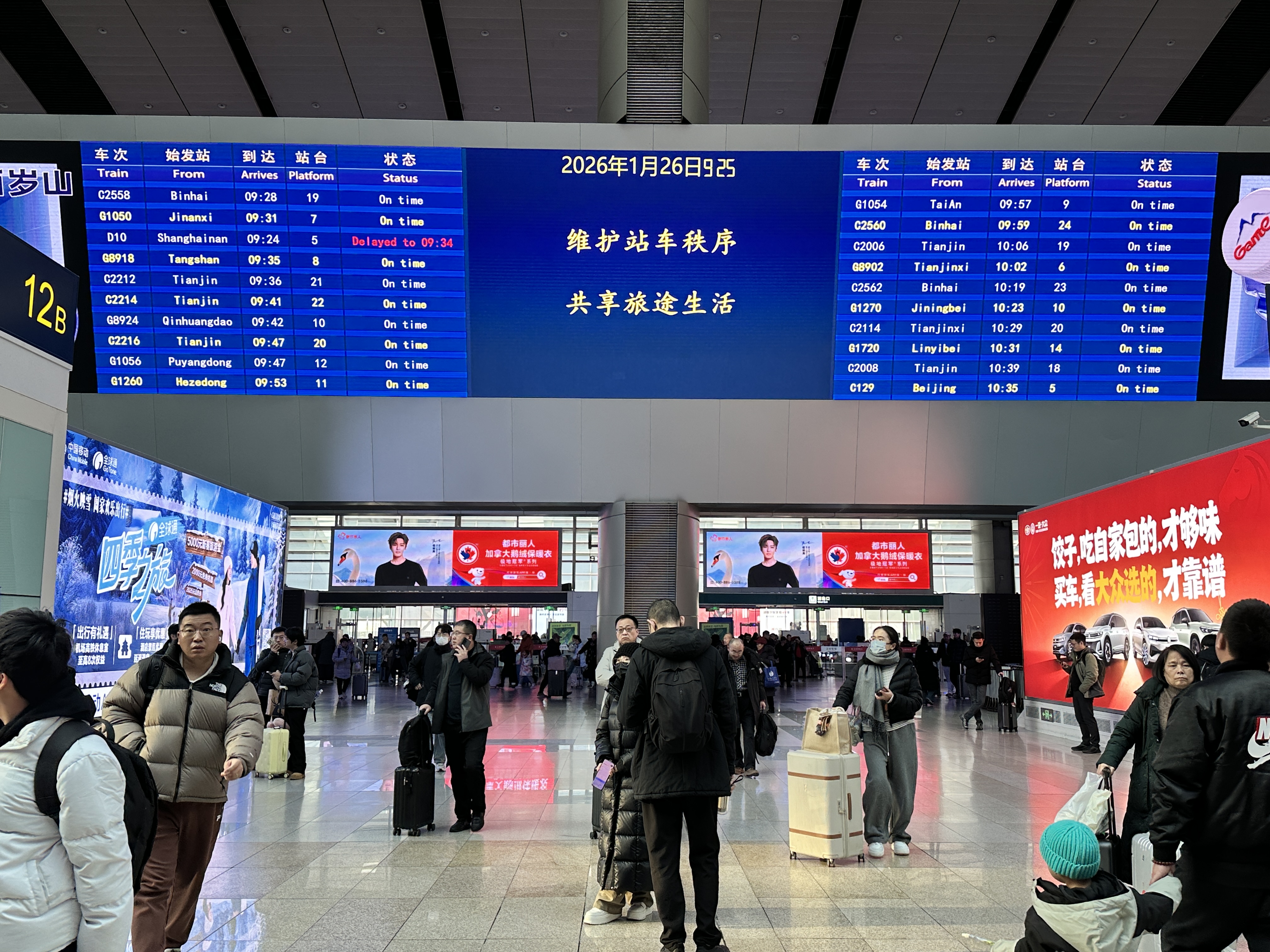 新图实施后,由北京南站发车的京沪高铁列车更“密”了。此次调整后,北京南站图定列车达到266.5对,168列京沪高铁更改车次。1月26日上午,北京南站候车厅的大屏幕显示,京沪高铁发车的间隔时间最短已压缩至3分钟。