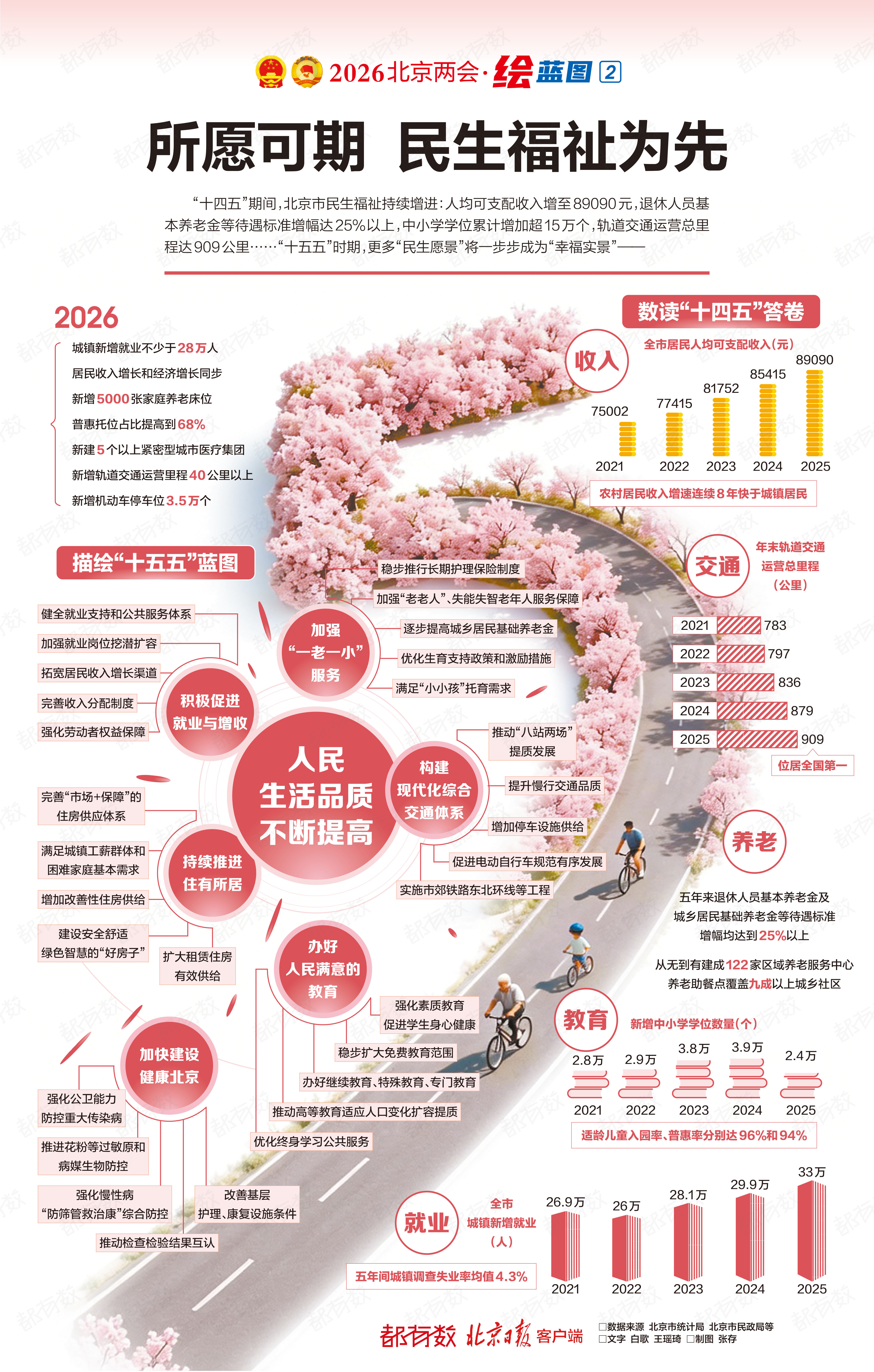 “十四五”期间,北京市民生福祉持续增进:人均可支配收入增至89090元,退休人员基本养老金等待遇标准增幅达25%以上,中小学学位累计增加超15万个,轨道交通运营总里程达909公里……“十五五”时期,更多“民生愿景”将一步步成为“幸福实景”——