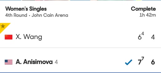 本场较量首盘,双方都守住各自的发球局。比赛进入“抢七局”,两人互有“迷你破发”。阿尼西莫娃抓住王欣瑜回球速度偏慢机会,7比4拿下,赢得首盘。