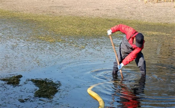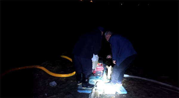 本次抽水作业强度大、时间紧。8名员工凝心聚力、日夜兼程,以高效协作保障任务推进。他们划分为三个班次,实行24小时全天候作业,确保抽水工作不间断开展。现场两台水泵同步运转提效,同时安排专人清理水下杂草,避免其吸入水泵影响抽水进度。在他们五天四晚的通力协作下,湖面水位稳步回落,岸边浅水区河床逐渐显露,结冰范围大幅缩小,冰面安全风险得到有效管控。