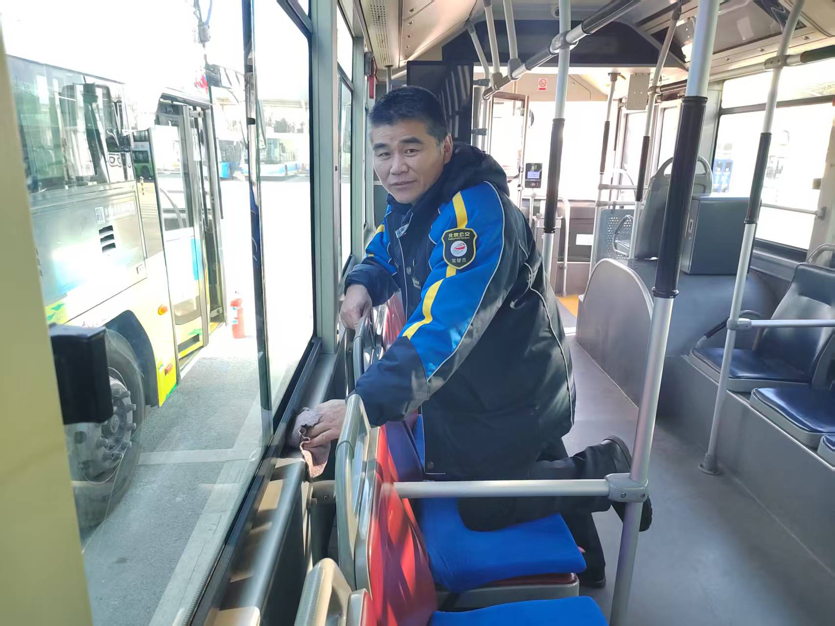 登上车厢,他先启动车辆低压闸通电,逐项检查报站系统、滚动屏和暖风设备。记者注意到,爱心座椅上整齐铺着一排蓝色棉垫。“冬运一开始就投入使用了。”张聆琳伸手摸了摸棉垫,确认没有破损和污渍,“不仅是66路,84路、556路、专33这些敬老爱老线路都装了。”