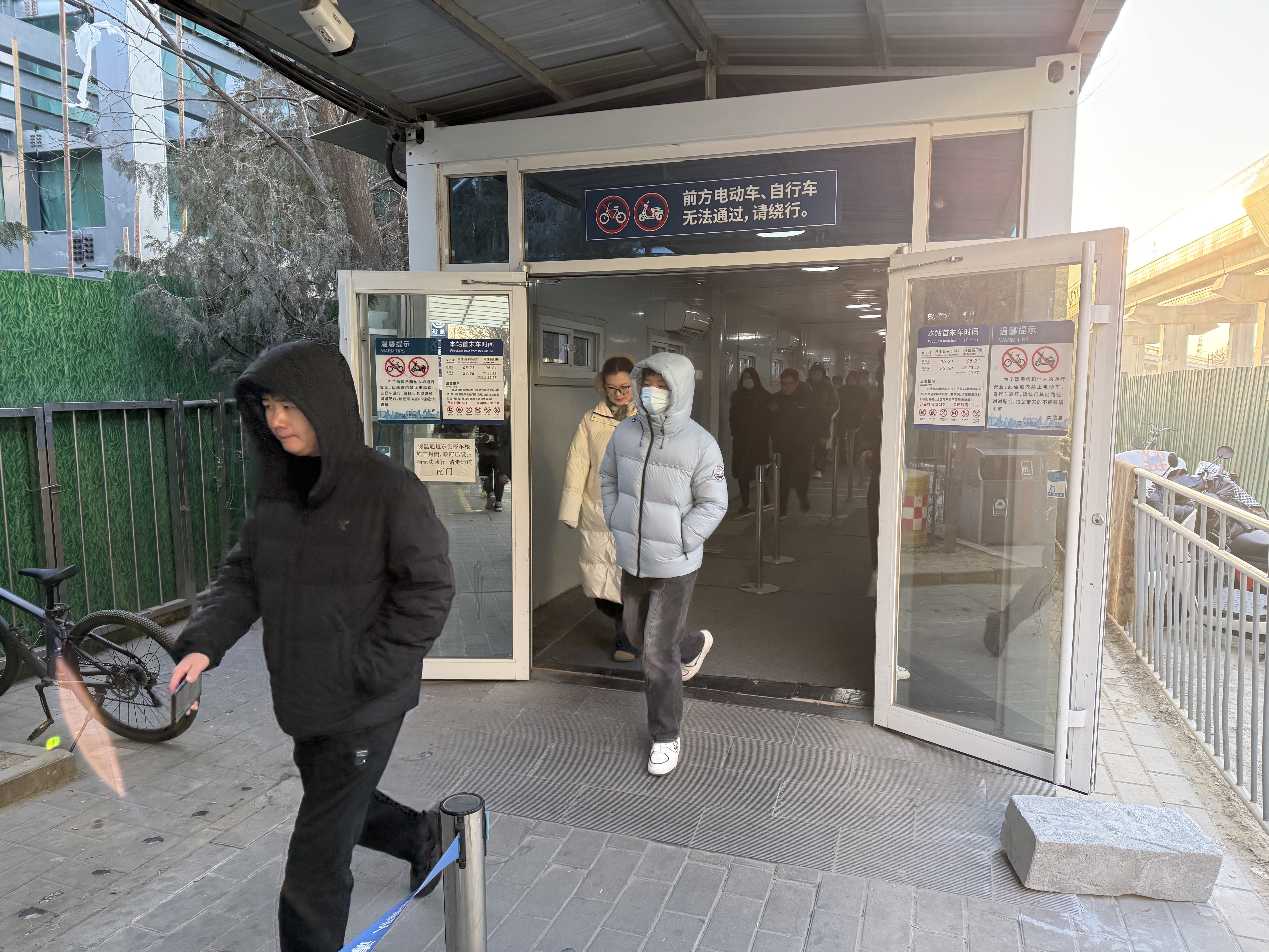 沙河站的各个出入口也加上了门帘,抵御站外吹来的寒风。各车站还会在首班车30分钟前开门迎客,减少乘客站外等待时间。