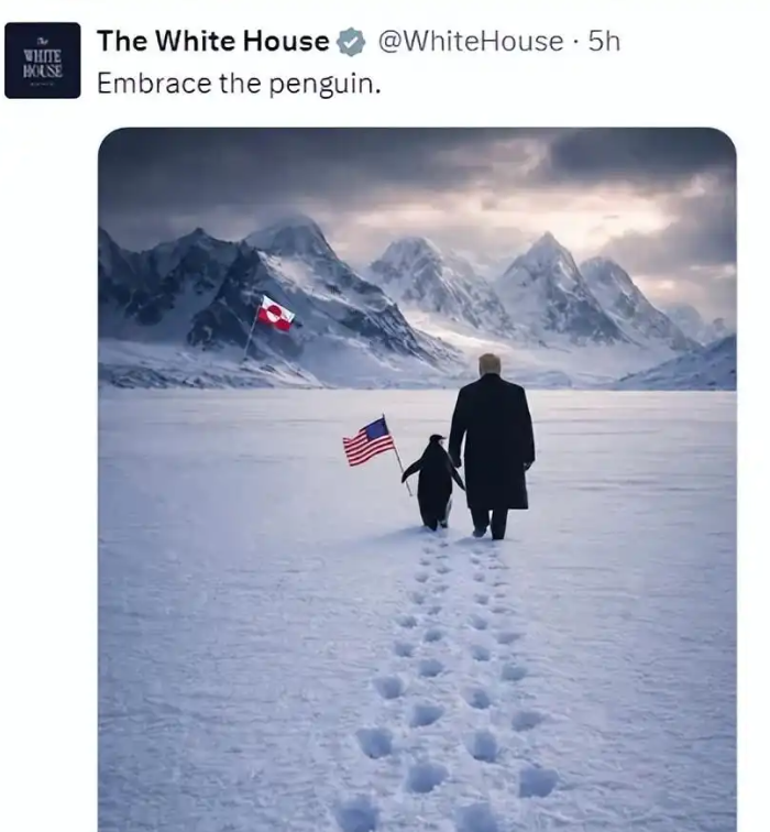 再说格陵兰岛,白宫官方社交账号23日发布了一张AI图片,画面中特朗普牵着一只举着美国国旗的企鹅穿过雪地,不远处插着一面格陵兰岛旗。帖子一出,全球网友替白宫尴尬,只能在评论区疾呼:“谢谢,企鹅生活在南半球”“讲真,格陵兰没有企鹅”。