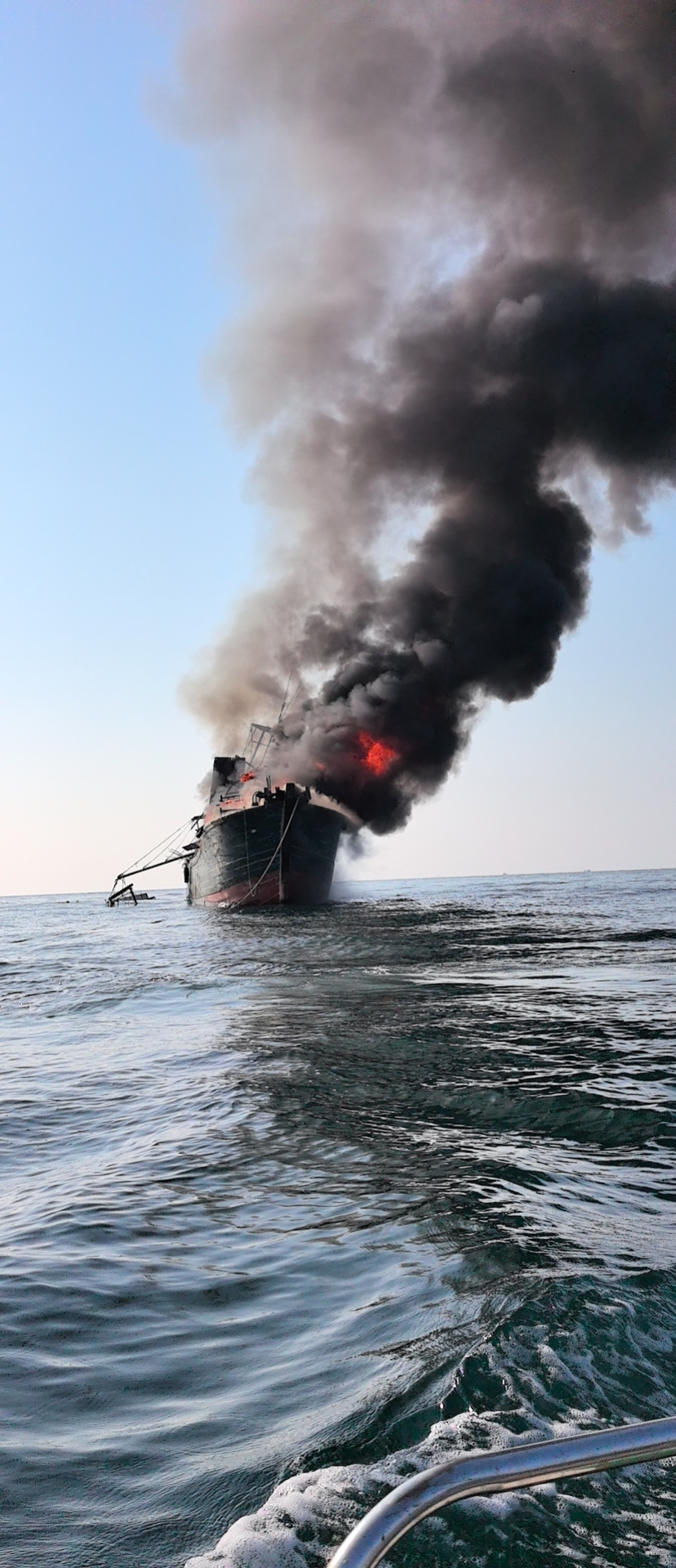 靠近着火的渔船后,唐孟雄发现一名头部受伤、头发已被烧焦的年轻船员,他果断喊话,让船员先跳海再施救,并抛出救生圈,将受伤的船员成功救上快艇。经询问得知还有船员被困,唐孟雄没有犹豫,冒着浓烟逆行寻找渔船上的被困者。
