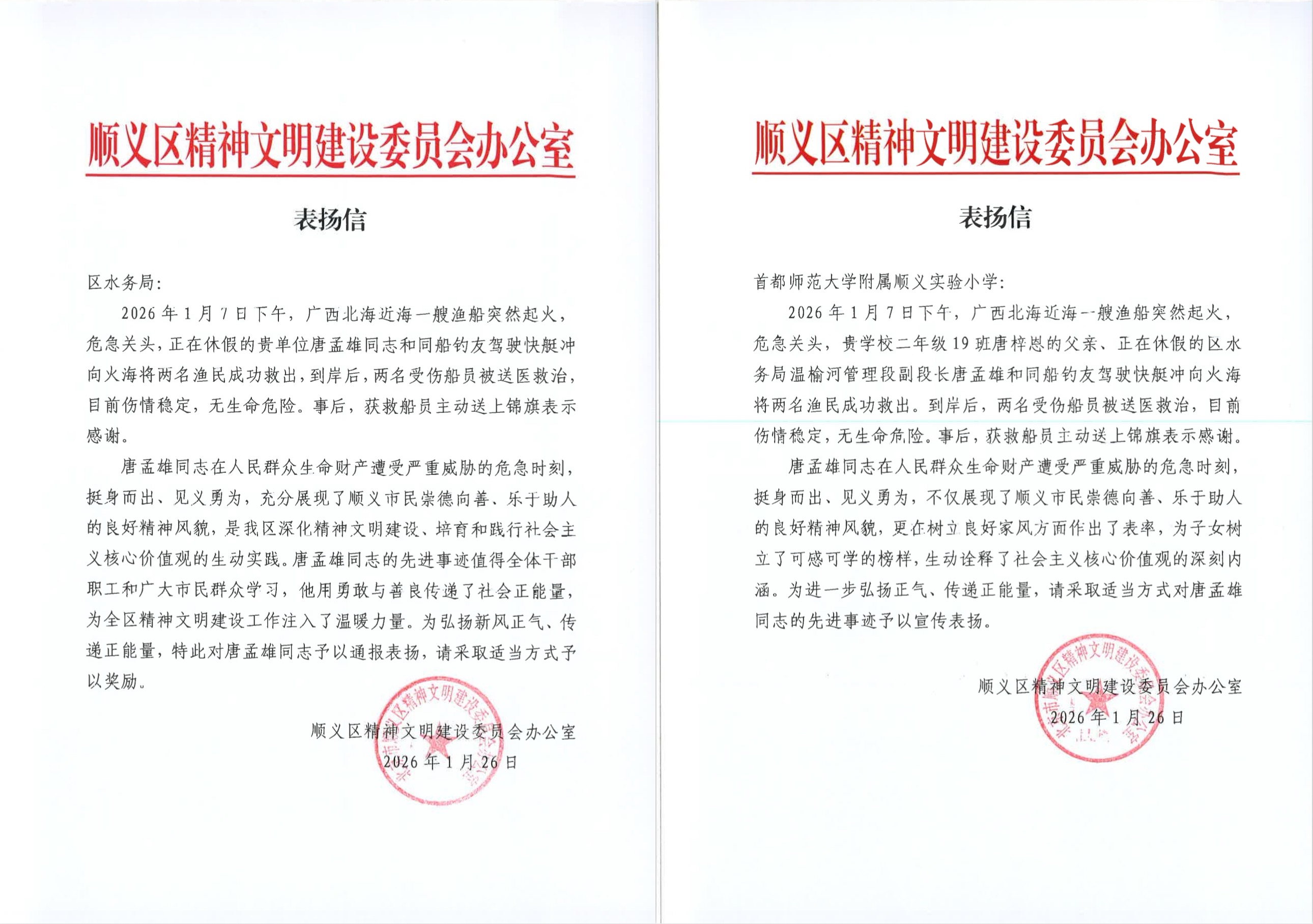 唐孟雄救人的视频被当地的渔船船主发到了朋友圈,也传到了北京顺义区他所在的单位。“唐孟雄同志的先进事迹值得全体干部职工和广大市民群众学习,他用勇敢与善良传递了社会正能量,为全区精神文明建设工作注入了温暖力量……”顺义区决定表彰其见义勇为精神,并把表扬信发往唐孟雄的单位。记者了解到,这也是顺义区自2023年开展“顺义好风气”建设以来发出的第4325封表扬信。