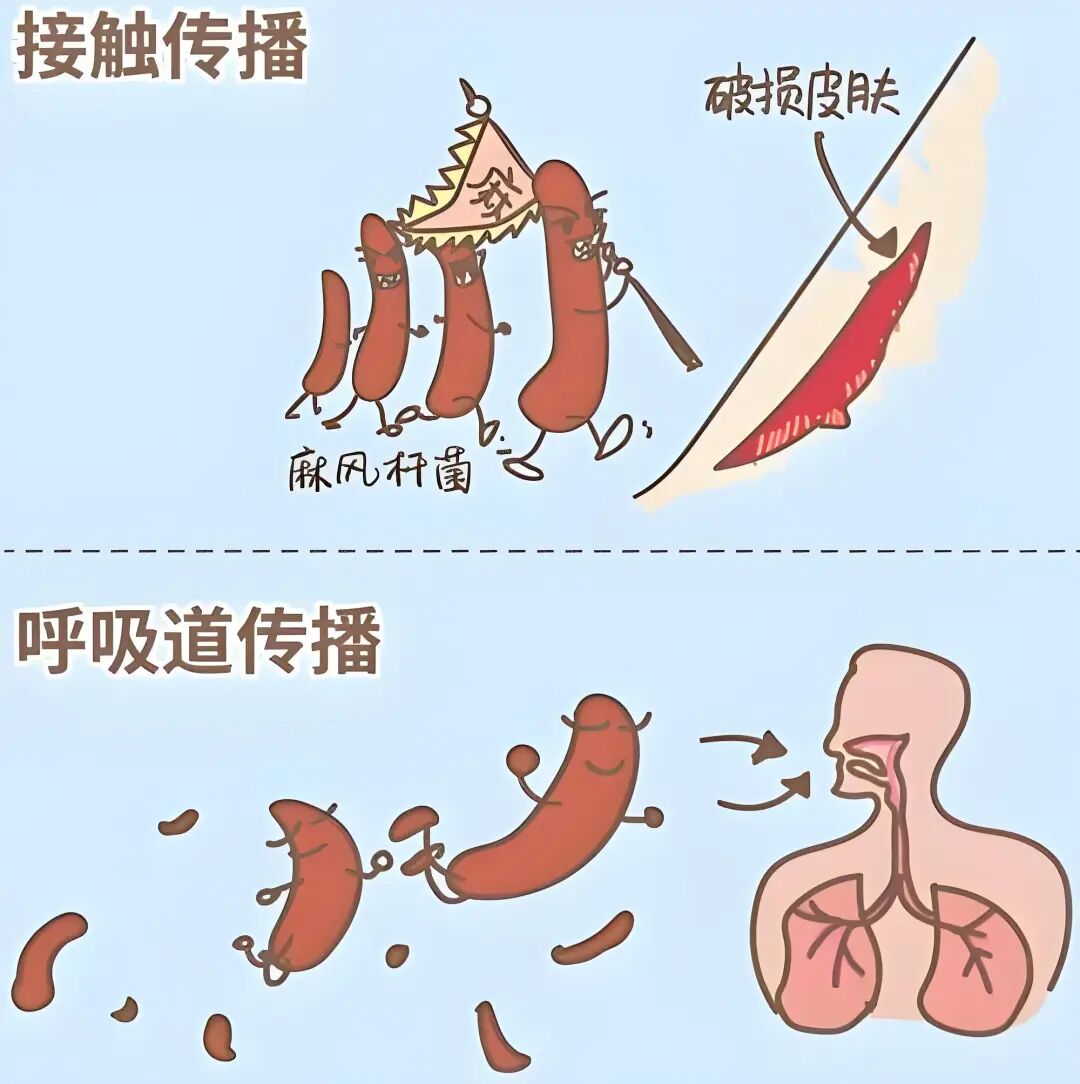 未经治疗的麻风病人是主要的传染源,麻风杆菌主要通过呼吸道、破损的皮肤与黏膜和密切接触传播,或通过接触麻风病人用过的衣物、被褥、毛巾、食具等间接传染。但麻风菌感染后会不会发病取决于机体自然免疫力,95%—99%以上的人对麻风菌都有自然免疫力,即使感染了麻风菌也不发病。