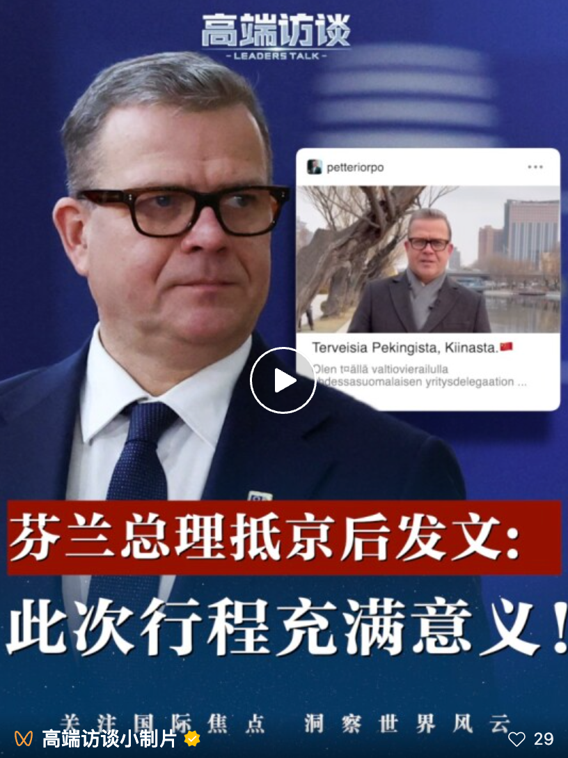 抵达后,奥尔波在社交媒体发文,“来自中国北京的问候。此次我率芬兰企业代表团进行正式访问,旨在为芬兰企业开拓机遇,进一步推动芬兰对亚洲市场的出口。此次行程充满意义!”