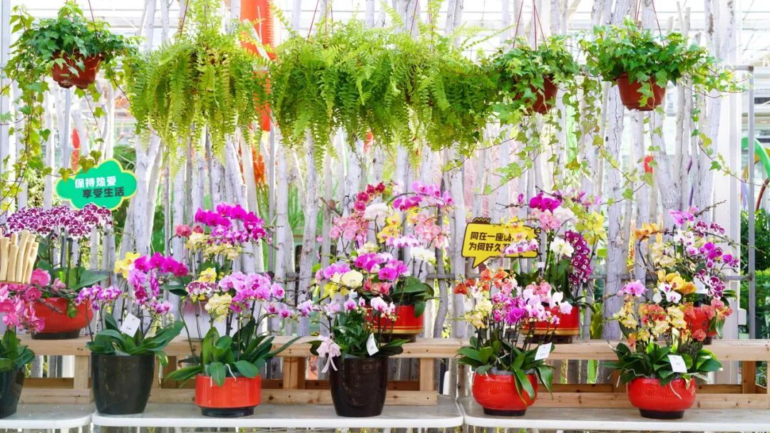 展厅内花卉品类丰富到让人眼花缭乱,30多个蝴蝶兰品种各具特色,花姿优雅惹人喜爱,杜鹃、海棠等200多个品种共计2万余盆花卉整齐陈列,每一盆都经过精心养护,长势旺盛。市民线上线下均可挑选心仪花卉,还可以亲手DIY定制专属盆栽。