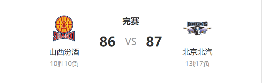 少了四名主力球员,客场艰难取胜。1月26日,在CBA常规赛第20轮比赛中,北京北汽队在客场以87比86险胜山西队,本赛季常规赛两队各胜一场。