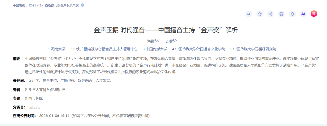 例如,《中国电视》杂志2025年12月号就刊发了海霞作为第一作者的文章《金声玉振 时代强音——中国播音主持“金声奖”解析》。文章的第一署名单位正是河南大学,第二署名单位是中央广播电视总台播音员主持人管理中心。文章第二作者刘娜曾多次与海霞合作完成学术文章。刘娜系中国传媒大学外国语言文化学院师资博士后,中国传媒大学石榴籽研究院研究员。