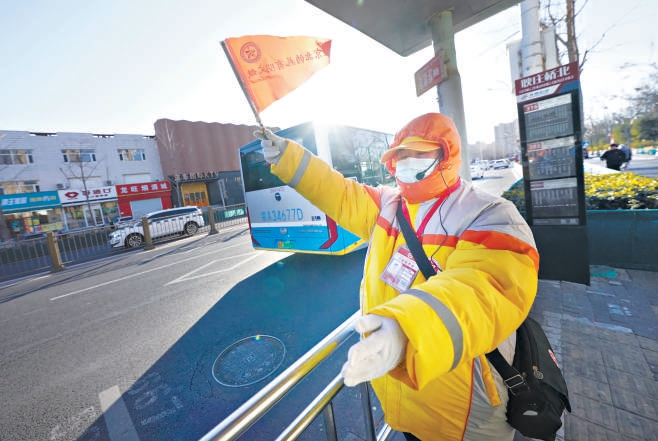 在通州区耿庄桥北公交站台,公共文明引导员在寒风中坚守岗位,引导车辆进出站台和乘客有序上下车。北京日报记者 方非摄