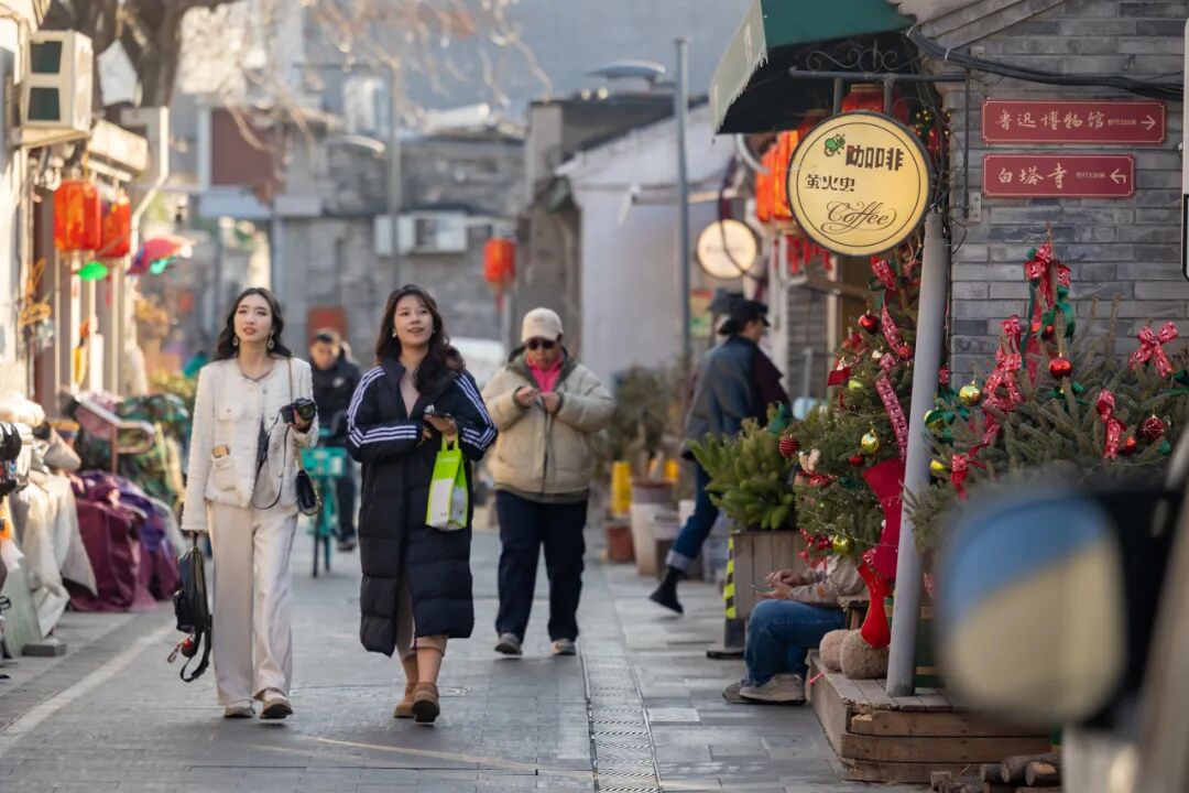 伴着阵阵浓郁的咖啡香,游客在宫门口东西岔胡同闲适散步