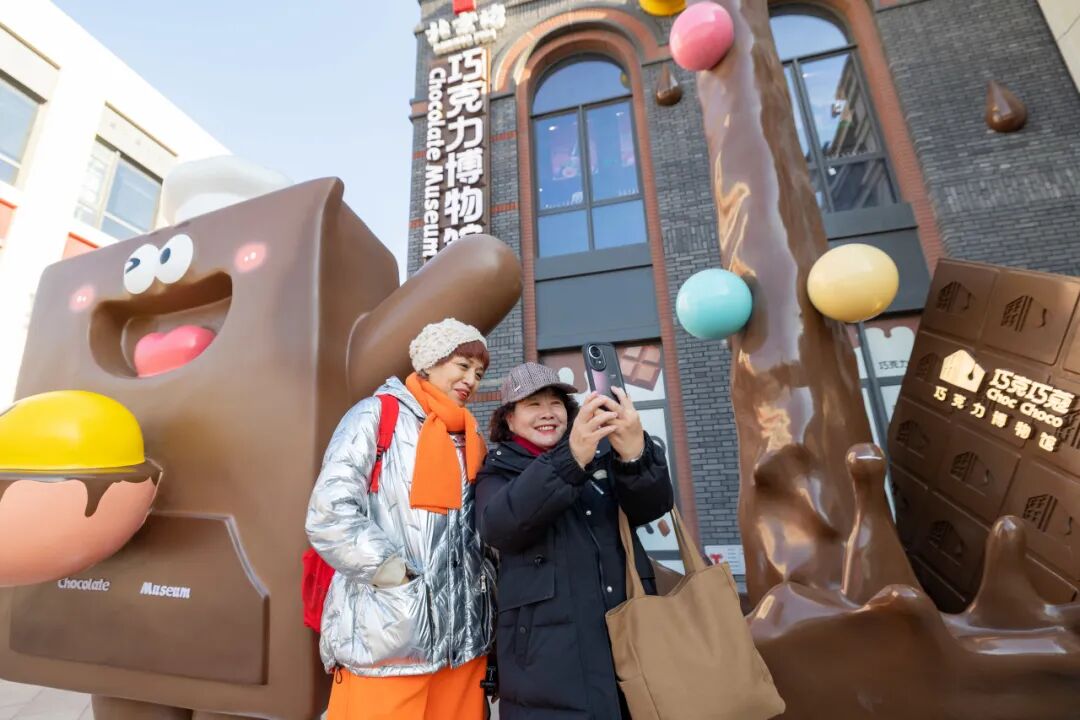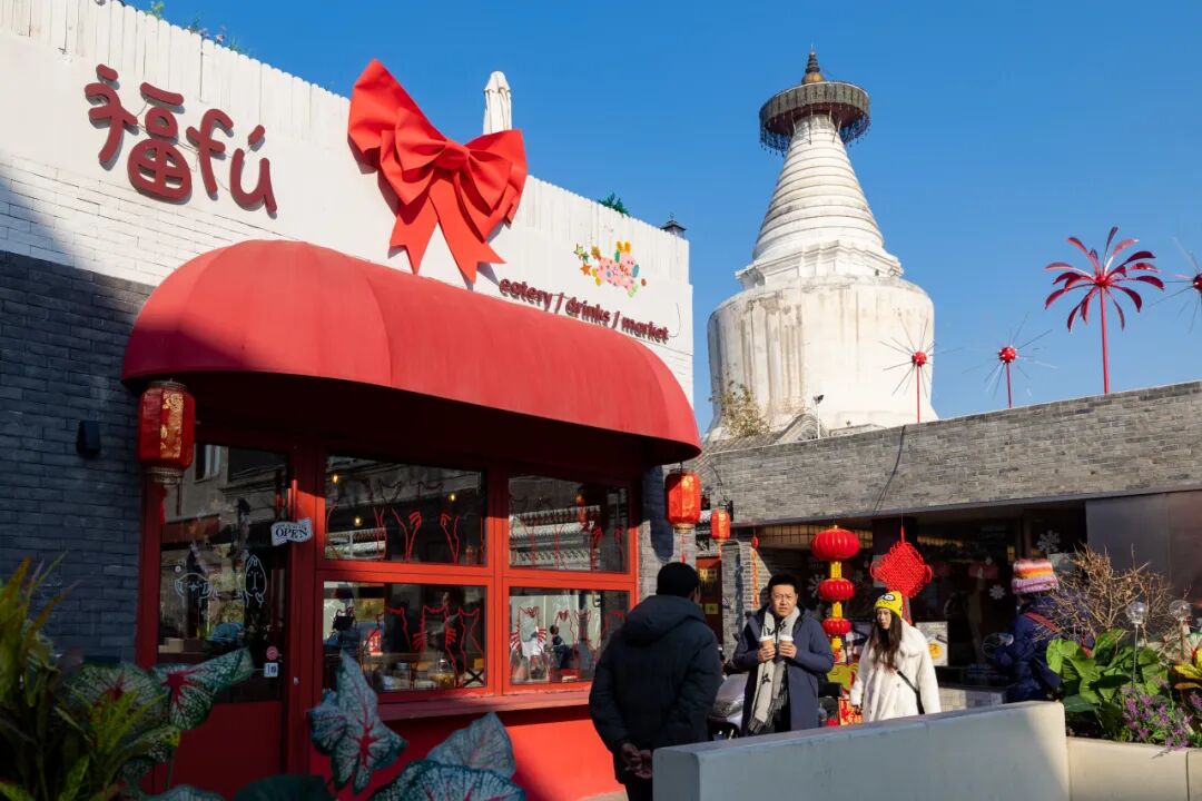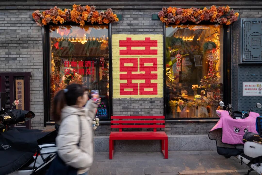 不远处的“澄象学堂”则带来了一份宁静与雅致。灰白相间的简约建筑与窗上鲜红的“囍”字窗花形成鲜明视觉对比,格外出片。店员主动上前,递上准备好的暖心小红包:“恭喜二位,沾沾你们的喜气。”这份突如其来的温暖,让这对新人真切感受到了胡同邻里的质朴温情。