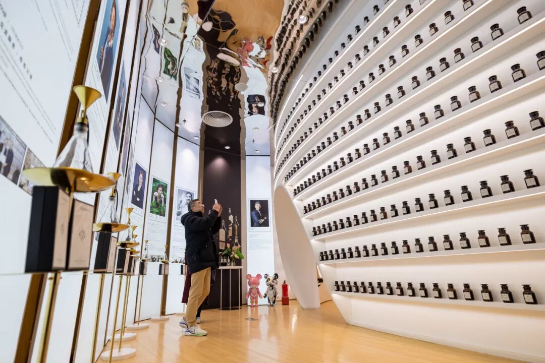 维维尼奥香氛艺术馆的展示墙摆放着各种气味的香水