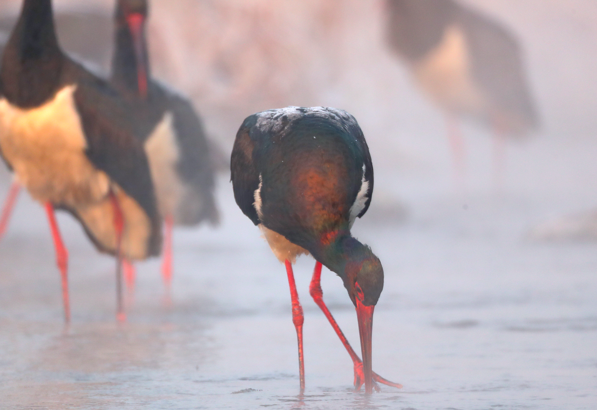眼下,总共有26只黑鹳在拒马河畔流连,要拍摄到它们并不容易。太阳还没跃出地平线,巡护队员就要藏到掩体中,呼出的气让三脚架和云台上结了冰。天色刚刚亮起来,睡醒的黑鹳就来到河边,不停地梳理羽毛,薄雾笼罩着河流,宛如仙境。