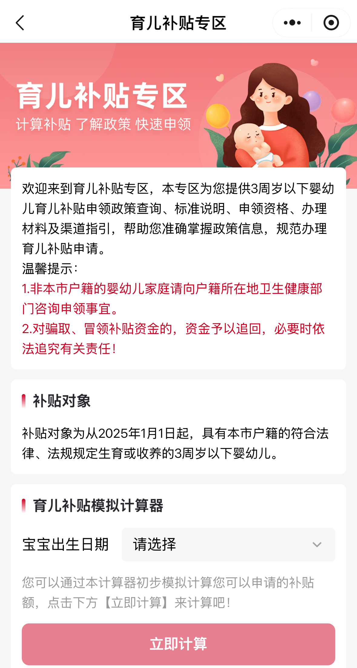 2025年9月底,北京市卫生健康委员会、北京市财政局联合印发《北京市育儿补贴制度实施细则(试行)》。规定从2025年元旦起,北京市户籍且符合法律法规规定生育或收养3周岁以下婴幼儿的家庭,可申领育儿补贴。按每孩每年3600元的标准,发放至婴幼儿年满3周岁。