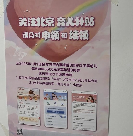 在提交申请不到两个月后,宋玉欣便收到了2025年全年的育儿补贴3600元。“这个过程中特别好的是,我还接到了社区居委会的电话,问我有没有提交申请?确实这项福利不是每个人都能及时了解的,需要多方提醒。”近日,2026年度北京市育儿补贴线上申领通道已经开启,记者在西城区、丰台区等多处居民楼内,都看到了育儿补贴申领的宣传海报,上面清晰列出申请渠道,提示家长及时申领,让补贴落到实处。