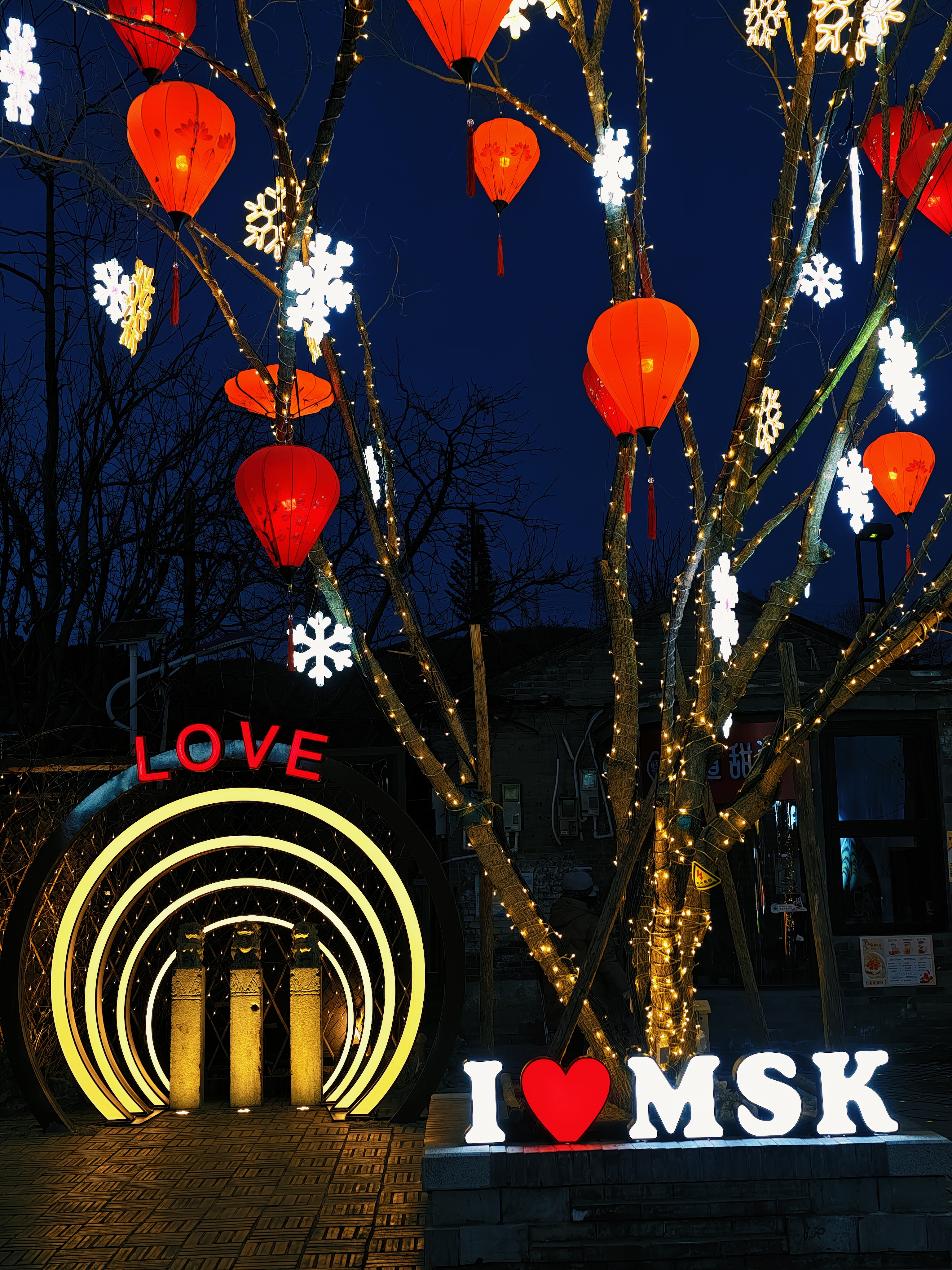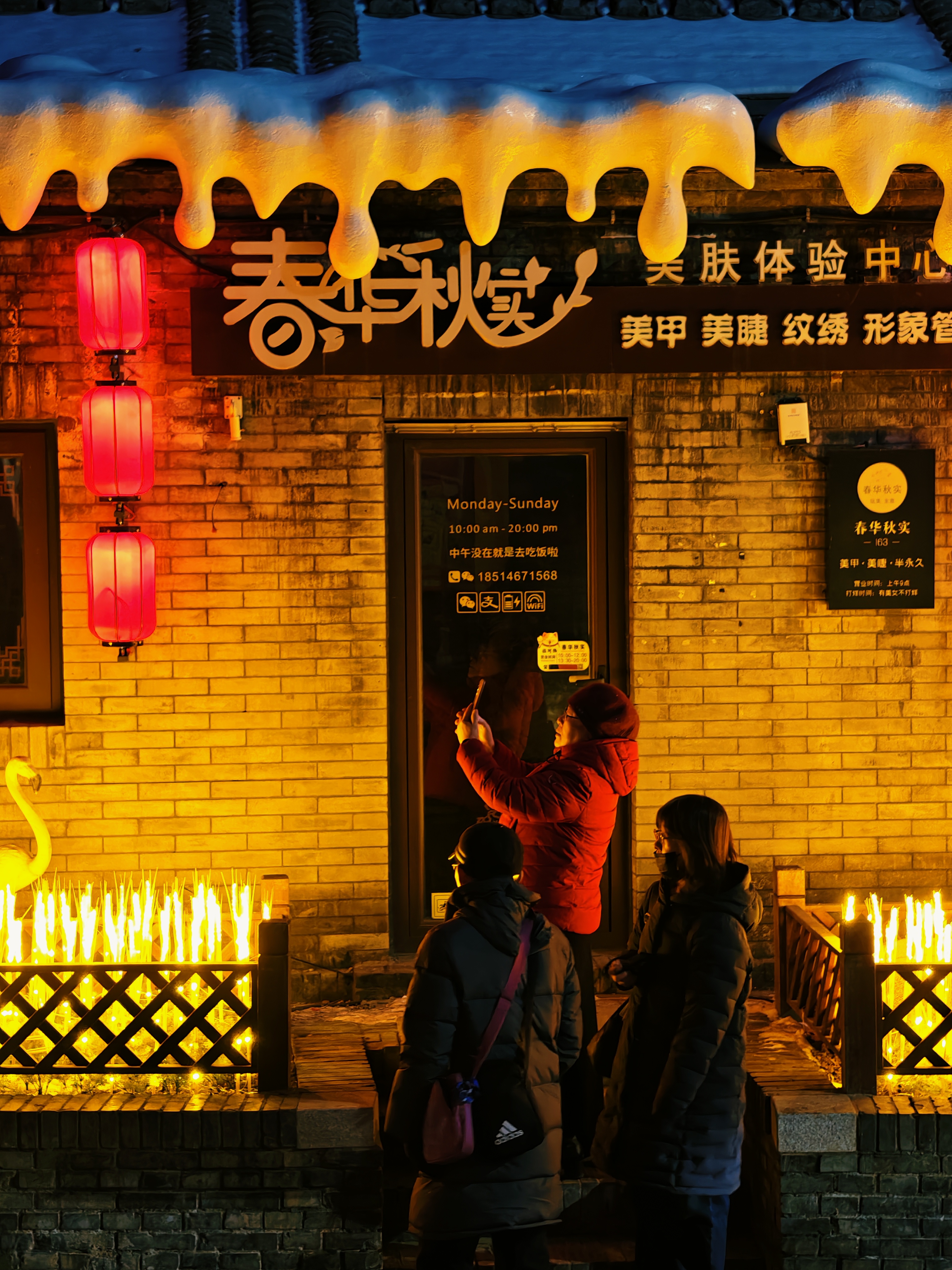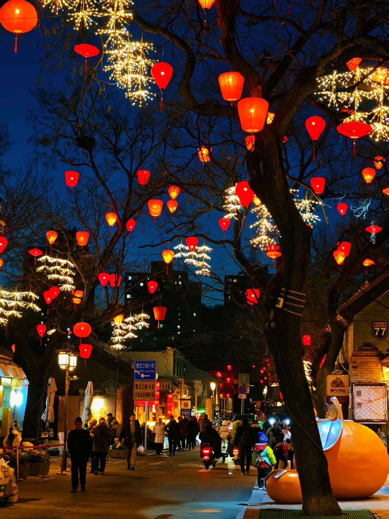 夜幕降临,石景山驼铃古道模式口大街华灯初上,大红灯笼与街边彩灯交相辉映,宛如繁星点点洒落人间,将整条街装点得如梦似幻。“花漾模式口”廊架流光溢彩,“一路繁花”景观铺满墙面,光影艺术与东方美学在此交融,让人仿佛穿越回那个繁华年代 。