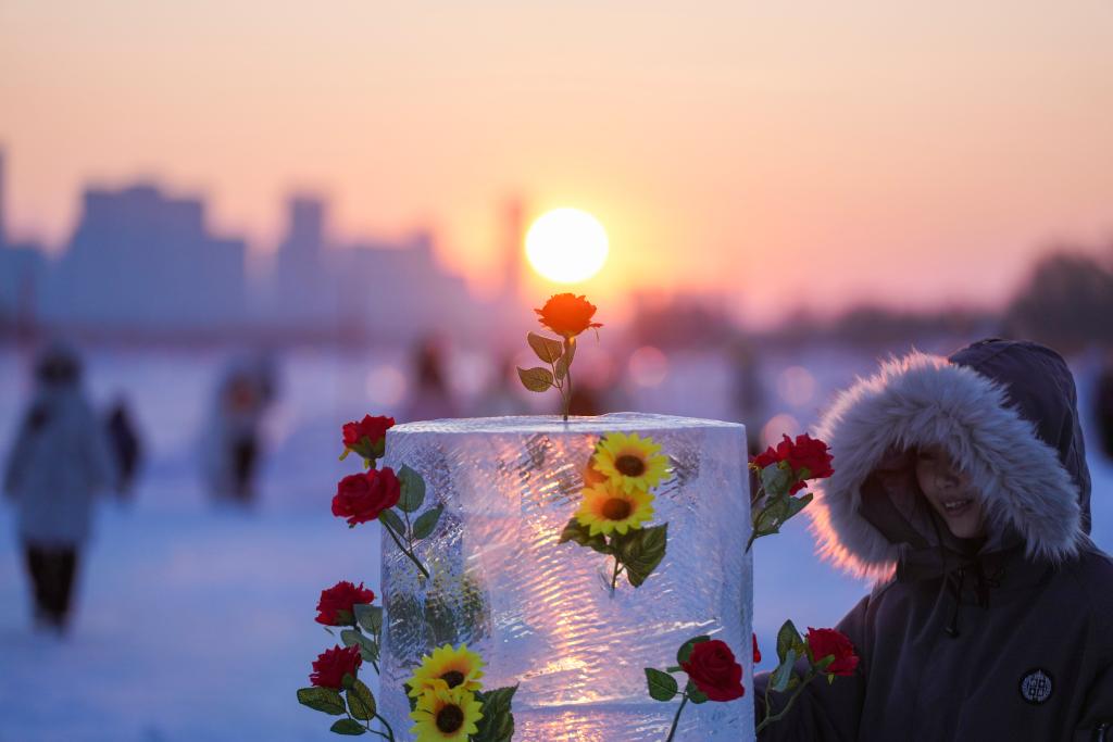 1月10日,游客在松花江哈尔滨段江面上体验“泼水成冰”。新华社记者 王建威 摄