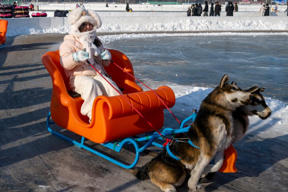 1月11日,游客在松花江哈尔滨段江面体验冰雪娱乐项目。新华社记者 王建威 摄