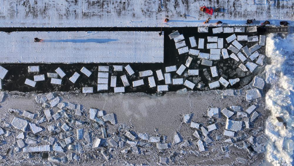 1月17日,在松花江哈尔滨段江面,工人在进行采冰作业(无人机照片)。新华社发(张树 摄)