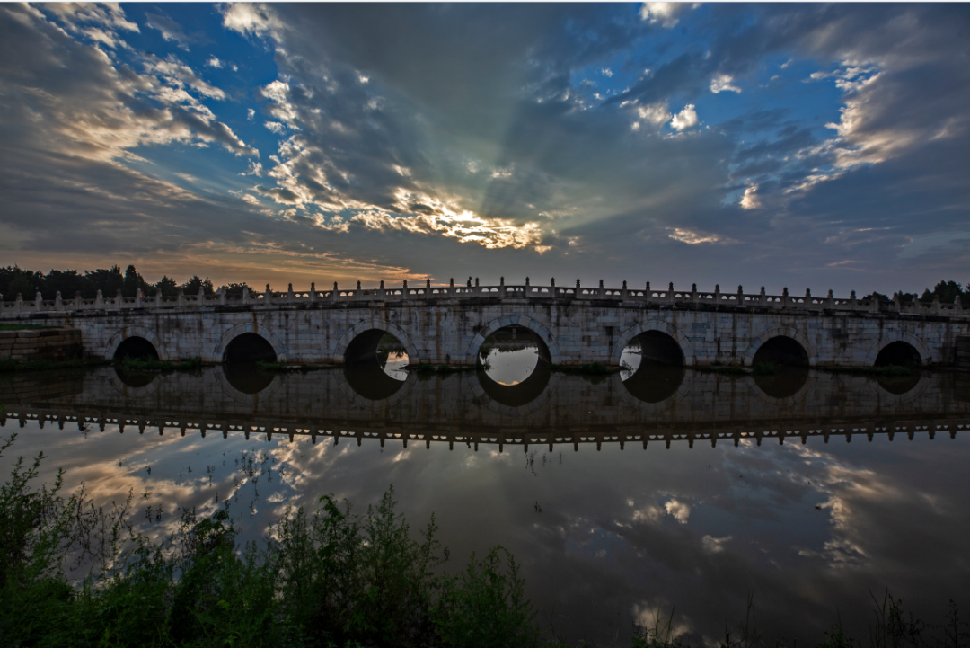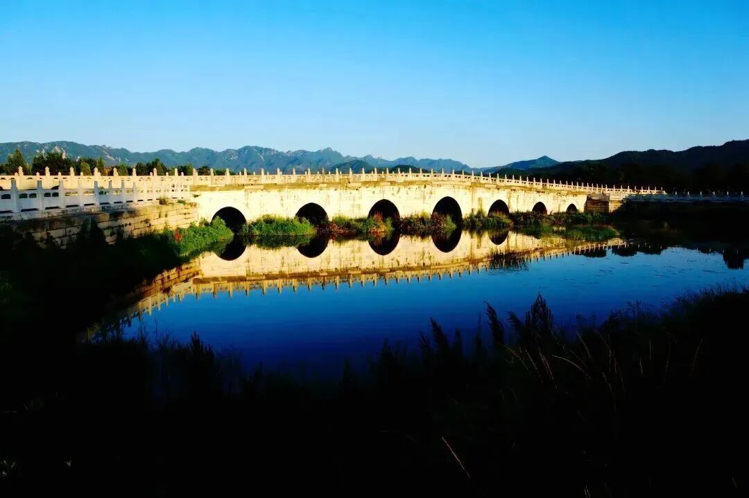 过一孔桥前行约800米,就到了赫赫有名的“五音桥”了。该桥真名叫孝陵神路七孔桥,总长近百米。两侧各有寻杖栏板63块,雕云朵宝瓶。二十四节气望柱头64颗,素面抱鼓石2块。是清东陵唯一的一座七孔桥,也是最长的拱桥。之所以有“五音桥”的雅号,盖因该桥之栏板、望柱,以硬物扣之则可发出清脆悦耳的金属之音,且因大小厚薄或质地差异而致音调、音色有别,故冠以“五音桥”之名耳。