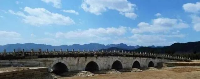 值得提出的是,清东陵内还有一组三座一孔桥,形制十分独特,它就是位于裕陵陵寝门前的玉带桥。这三座玉带桥桥面的两边安装青白石栏杆,柱头雕云龙、云凤,每个桥洞龙门石上雕霸下。更为新颖的是,桥栏杆的两端改变了传统的抱鼓石形式,而是每端各透雕一只蹲踞昂首的靠山龙,靠山龙的麟、蹄、鬃、嘴诸部位雕刻得十分精细,栩栩如生。这三座一孔桥体量虽小,但精致非常,在清朝皇家陵寝建筑中是独一无二的。
