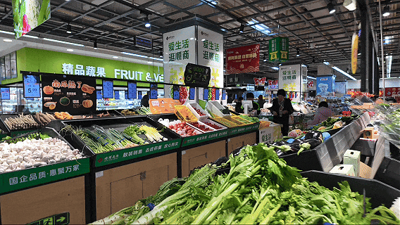 超市刚开门不久,生鲜区里,五花肉、后臀尖整齐码放在冷柜中,蔬菜水果鲜灵灵地排在货架上。采价员兰英手持一台黑色数据采集器,正对着价格标签拍照。