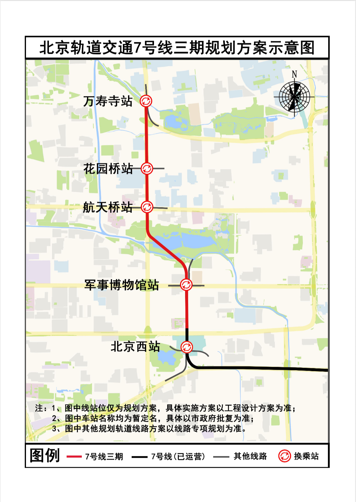 北京轨道交通7号线三期是国家发展和改革委批复的北京市轨道交通第三期建设规划项目之一,是既有7号线由北京西站向北的延伸线。线路起点北京西站(不含),终点万寿寺站,全部位于海淀区,串联北京西站、军事博物馆、万寿寺、航天桥等重点区域。项目的建设可改善沿线地区对外出行条件,提供大容量、公交化的轨道交通服务。