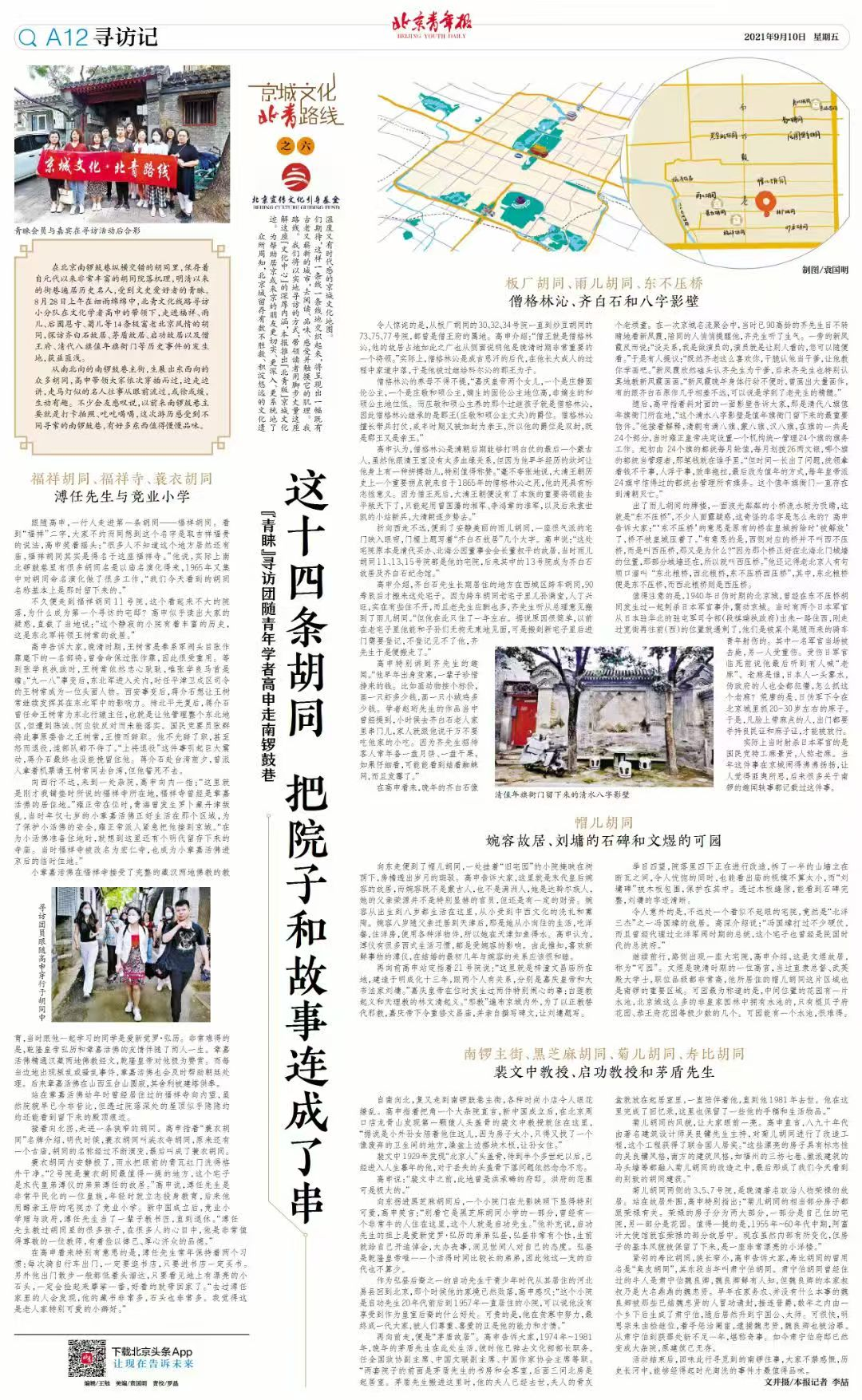 这件事似乎就是我在做的,尽管时间并不算长。也就是一年多之前,北京文史界的前辈朱祖希先生跟我讲,“你的身体要更好,像我一样,八十多岁的人了,爬山打球半天都不会累。因为我年轻的时候,跟着我的老师侯仁之先生到处跑。到现在,每天必须足量活动的习惯,早已养成。”他一边说,我一边赞叹。“可不是单纯的户外活动,我是有目的的,那就是要探索自己感兴趣的领域。比如,我在北京城里,就会探索数不清的胡同。它们的肌理,它们的前世今生。”老爷子的话,对我启发很大。实际上,在京城内进行的类似探索活动,早在十几年前便开展起来了。那时候的牵头者,是一个叫作“老北京网”的民间组织。但那是一种“爱好者俱乐部”的运作,还没有普及到更多的民众。