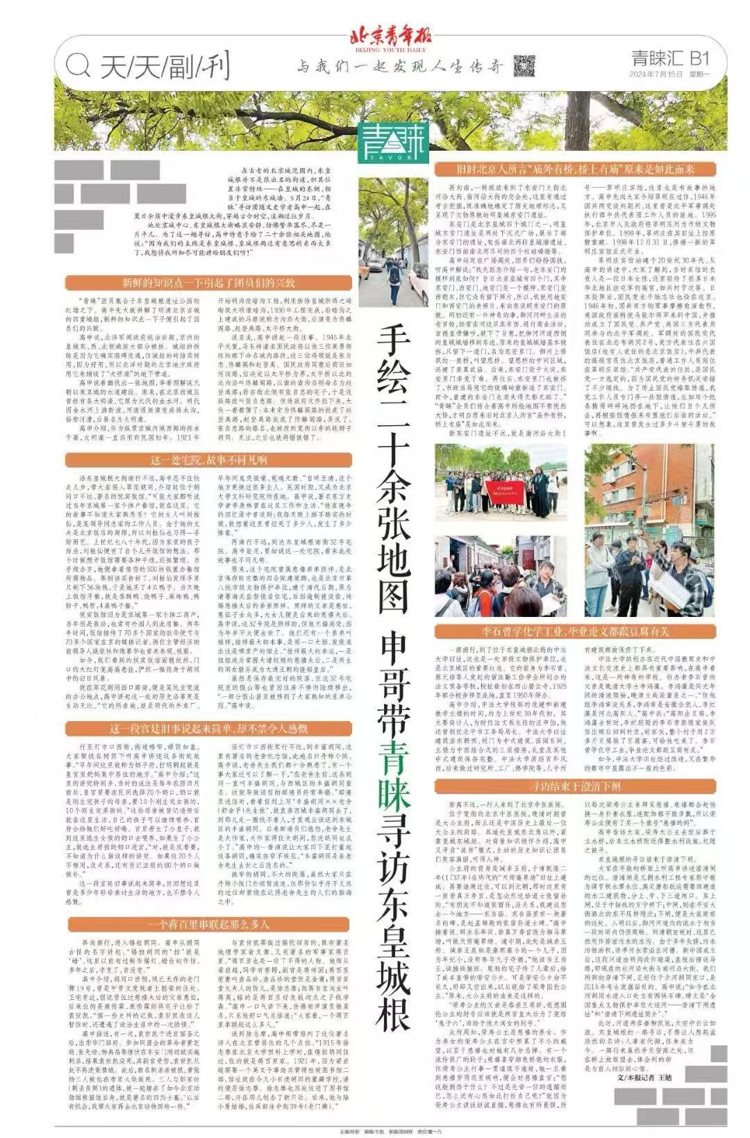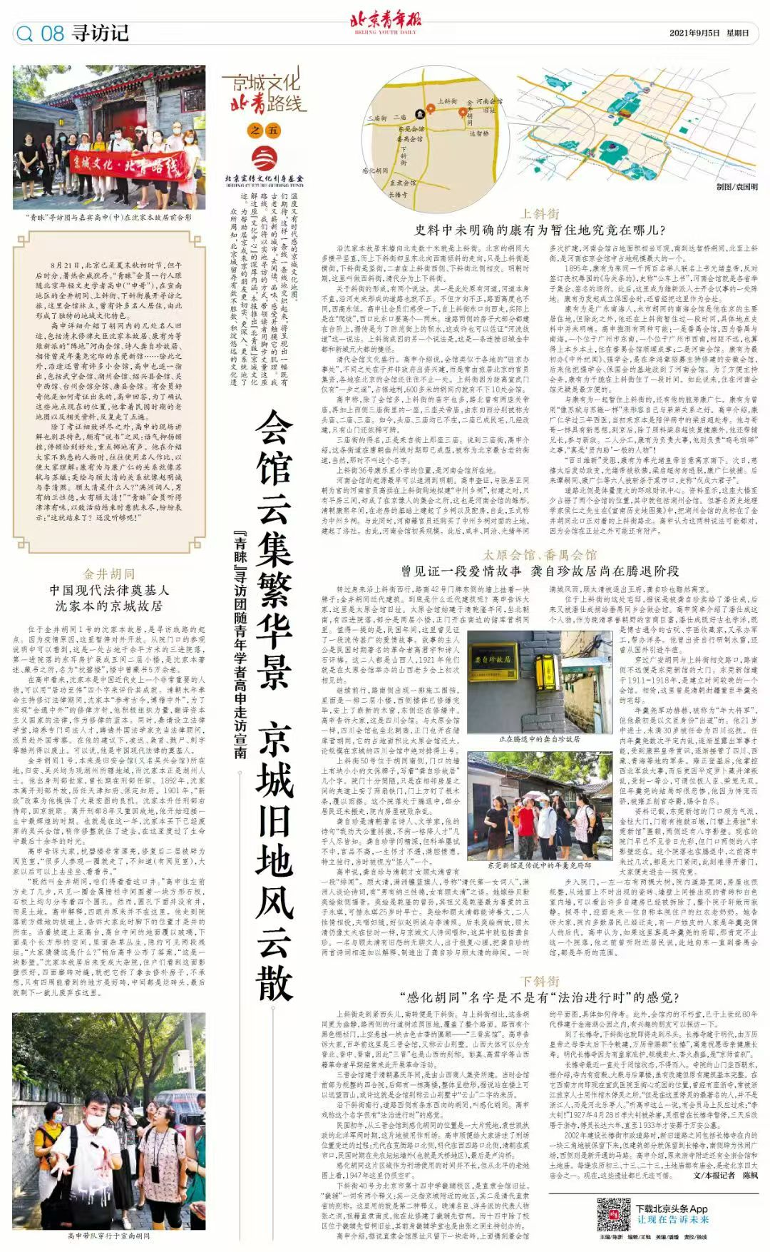 近一年来,我在北京东城区、西城区、海淀区、朝阳区、大兴区的图书馆举办讲座,也利用北京导游协会、中青旅、北青旅等平台进行讲座,介绍北京的“城市考古”。2021年8月,北京青年报组织了两期由我带队的“青睐城市考古”,将宣南地区、南锣地区游走一番,收获几十万的在线收视率。如今,我会在每个周末组织城市考古活动,基本上选择不太热门,甚至是完全冷门的路线,但依然能吸引到不少参与者。