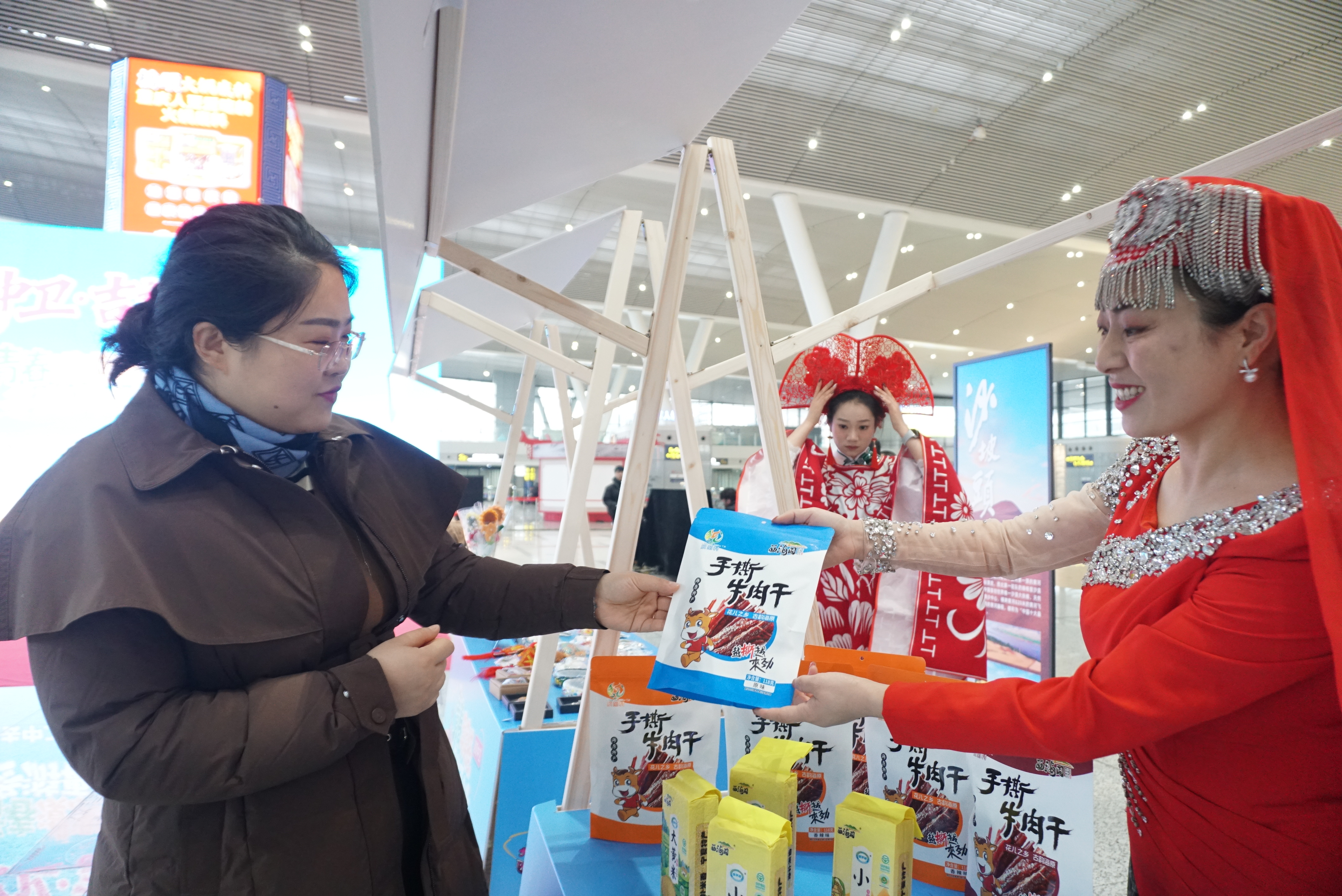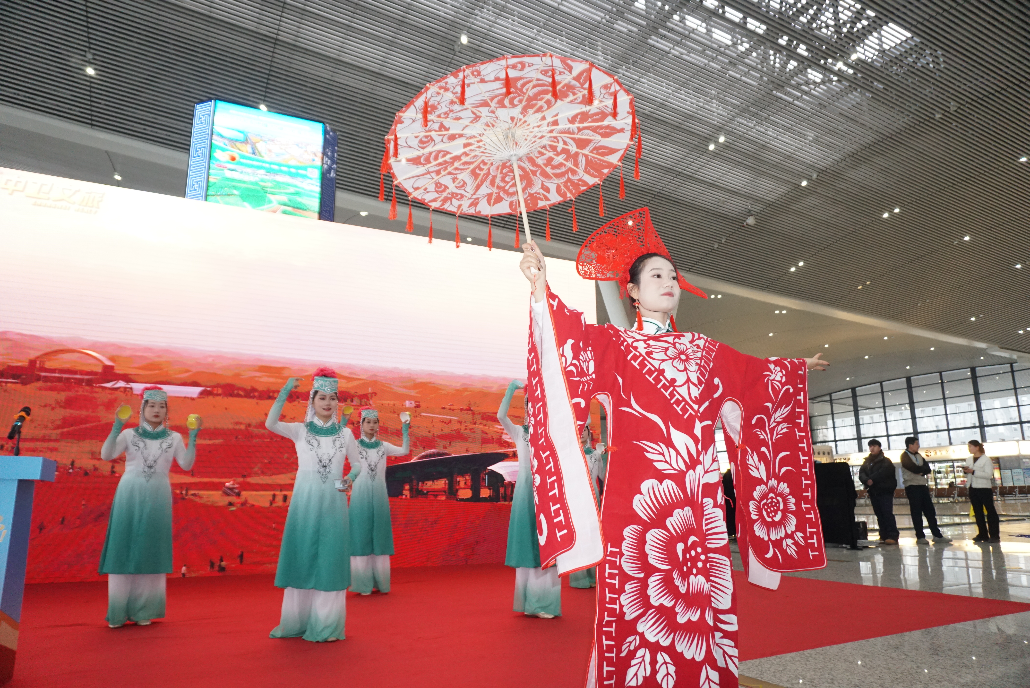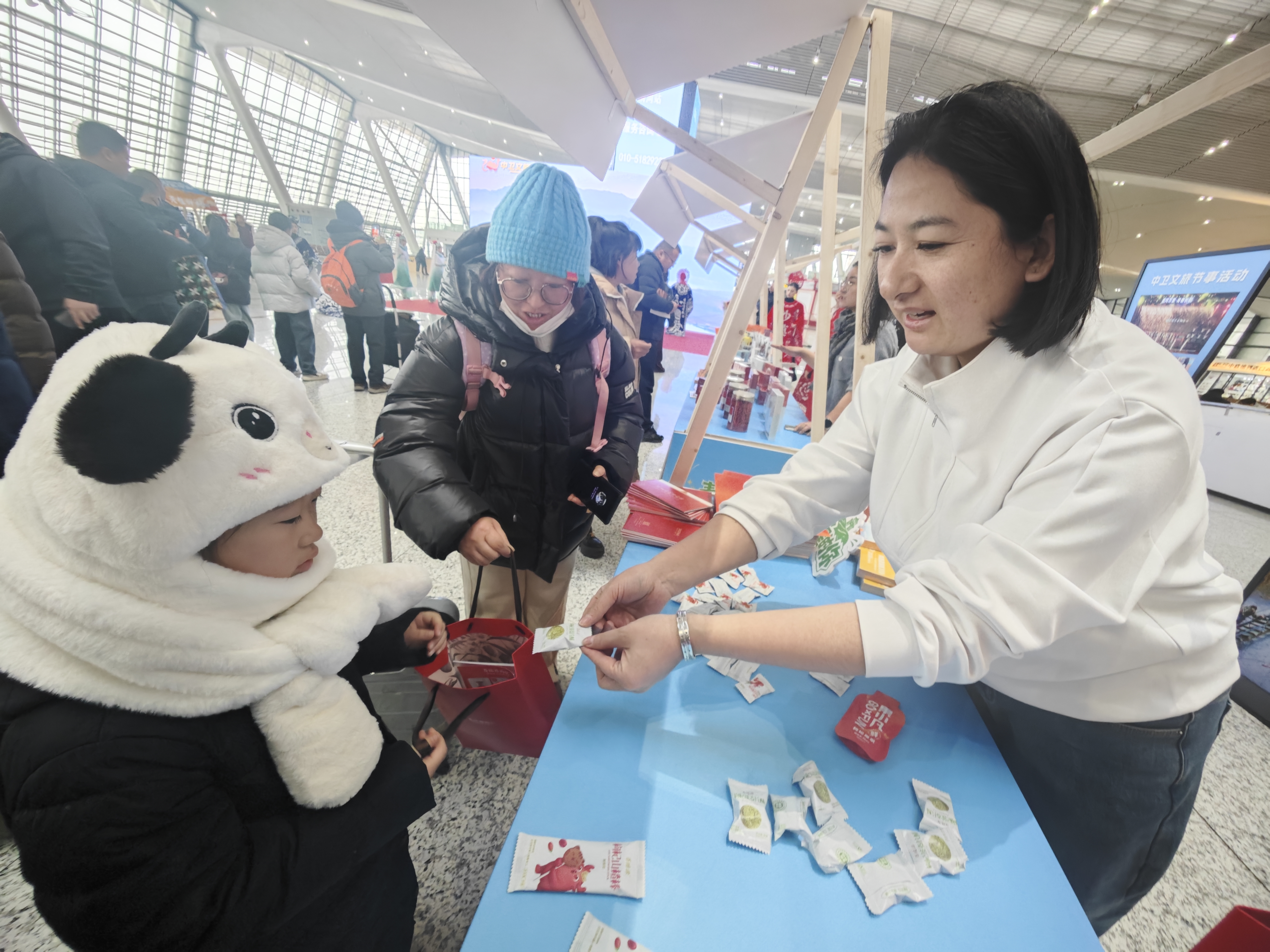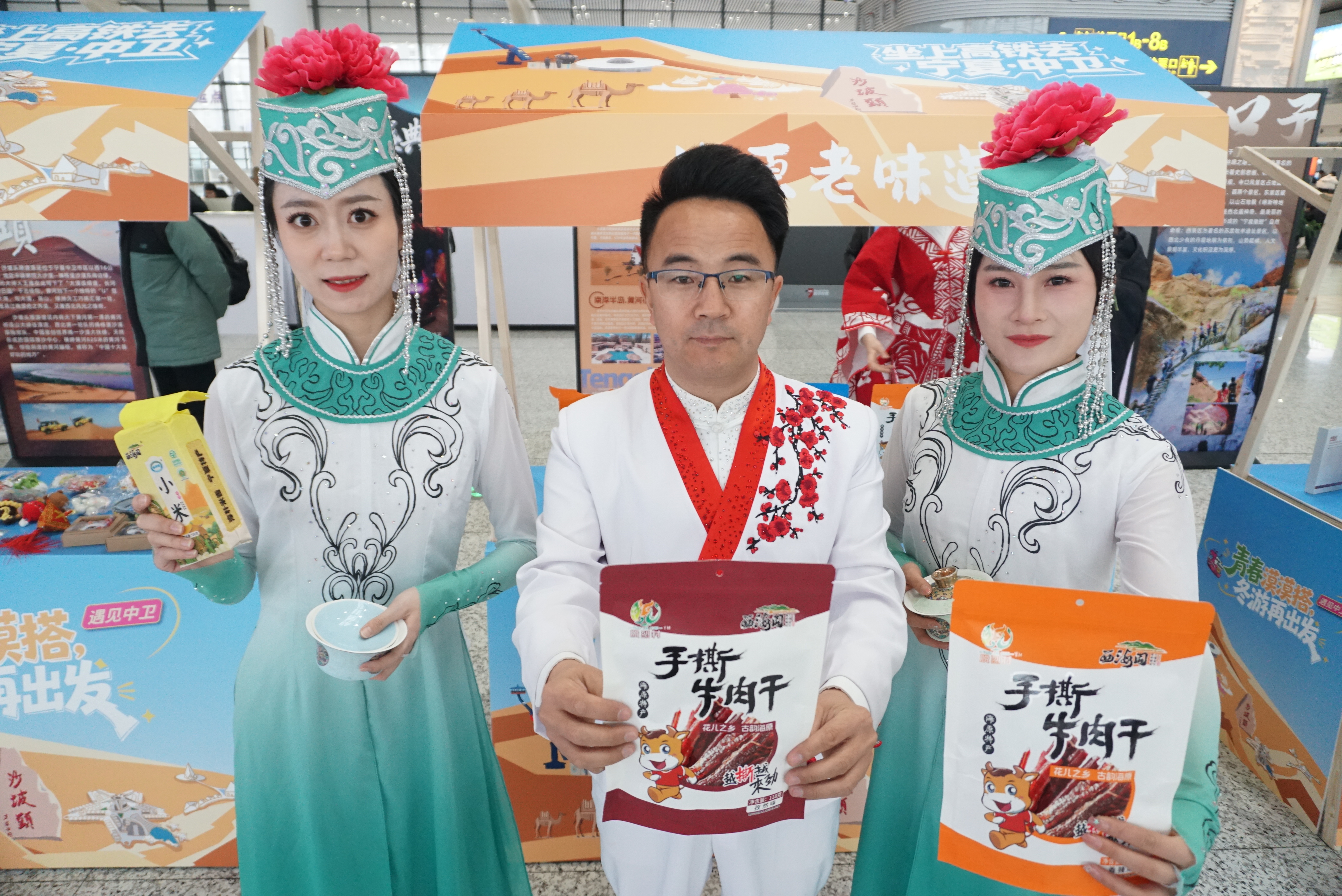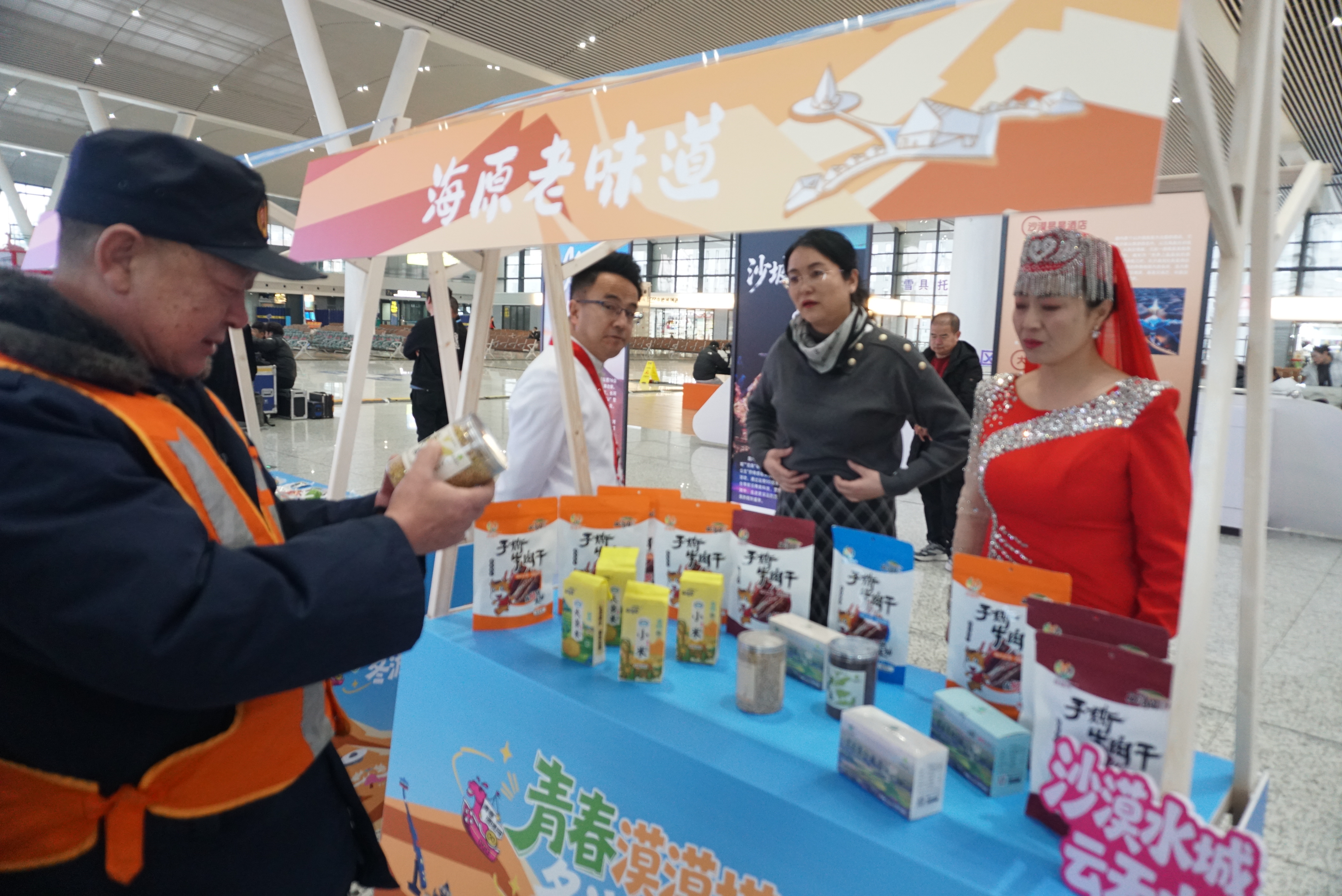 活动现场,一场场精心设计的互动体验,让繁忙的交通枢纽瞬间充满了宁夏风情的欢声笑语。情景剧《冬游去中卫》生动还原了沙漠雪地中嬉戏的欢乐场景,“行走的非遗”表演将传统技艺与现代舞台融合,展现“非遗正青春”的鲜活气息;海原花儿用质朴唱腔传递塞上风情。