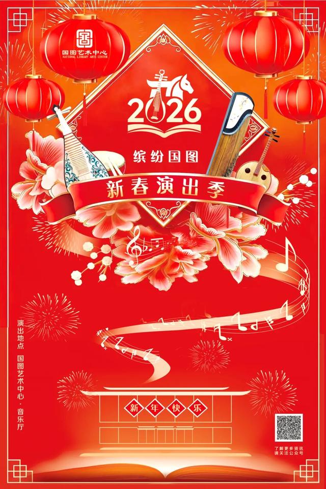 岁启新元,艺暖新春。「缤纷国图·2026新春演出季」,五天五场,场场精彩,用多元艺术演绎新春祝福,用文化温情凝聚团圆力量。赶快点击文末阅读原文进行购票!这个春节,告别喧嚣,奔赴国图艺术中心·音乐厅,与家人挚友一同沉浸艺术之美,共贺马年新春、共品岁月艺美,度过一个祥和雅致、回味悠长的文化新年!