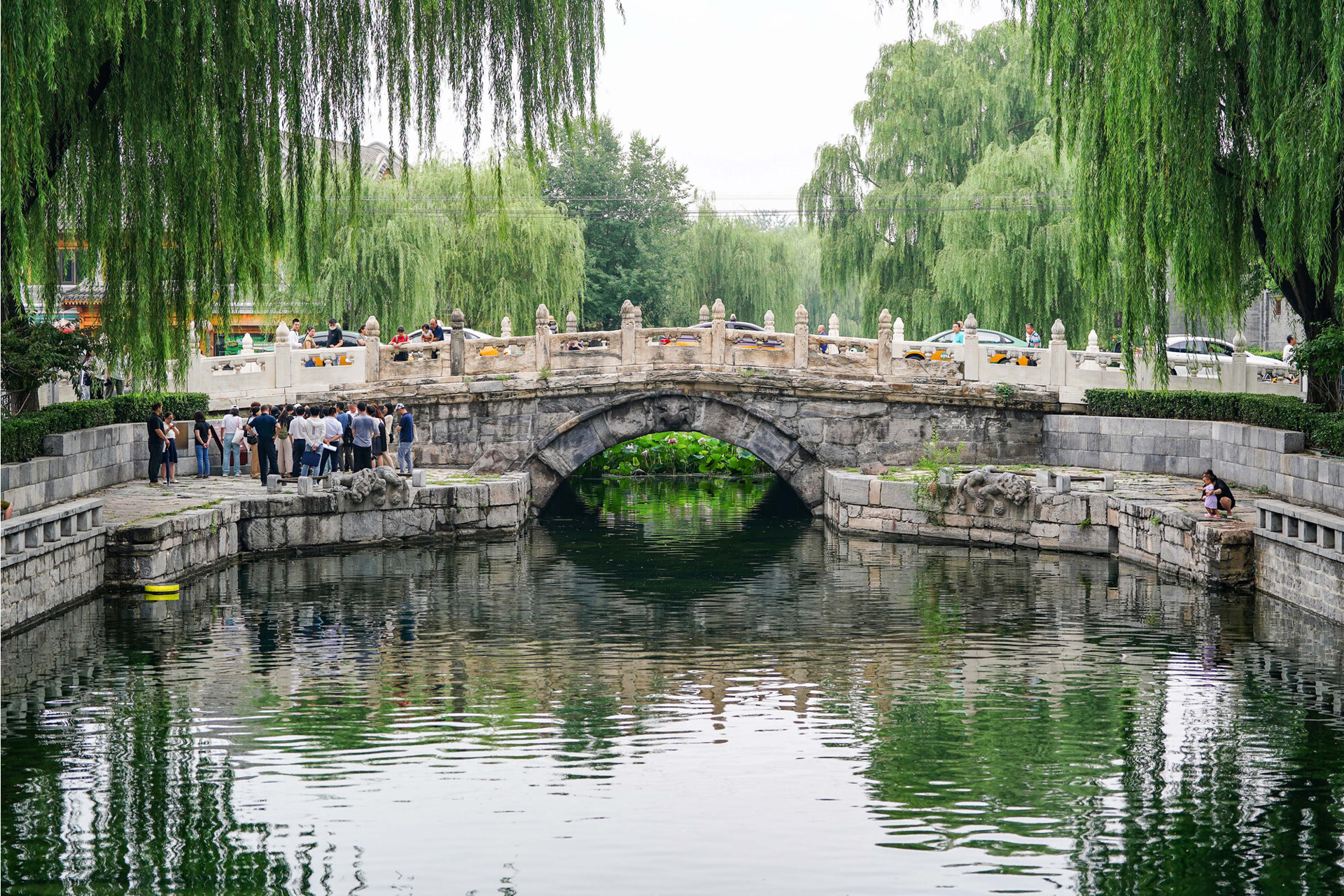 万宁桥上的汉白玉栏杆坑坑洼洼,桥头桥尾的栏杆都是新修的。桥下一个半圆的拱洞,通惠河水从桥洞流过。万宁桥始建于元代,桥边有一块写着“大运河澄清上闸遗址”的石碑,澄清上闸是元朝水利工程专家郭守敬为调节积水潭水位、满足漕船航运需要而建造的重要水工建筑物。澄清闸与东侧万宁桥连为一体,成为积水潭东岸、通惠河起点处重要水上交通枢纽。历经数百年,万宁桥下现在还保留有一个镇水兽的遗存。