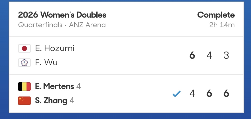 北京时间1月28日,在2026澳网女双第四轮比赛中,中国球员张帅搭档比利时球员梅尔滕斯以4比6、6比4、6比3逆转穗积绘莉/吴芳娴,率先晋级四强。