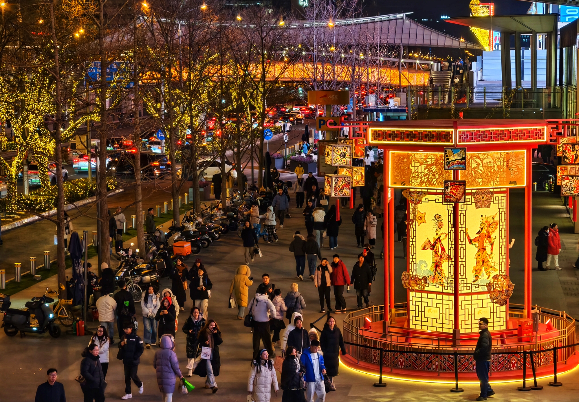 近日,西单商业街的行道树被万千暖黄灯串点亮,宛如金色星河倾泻人间。过街天桥披上橙红盛装,与路面车流的霓虹光影交相辉映。步行街上,巨型宫灯装置流光溢彩,往来行人在融融暖意里,共赴一场属于京城迎新春的浪漫。