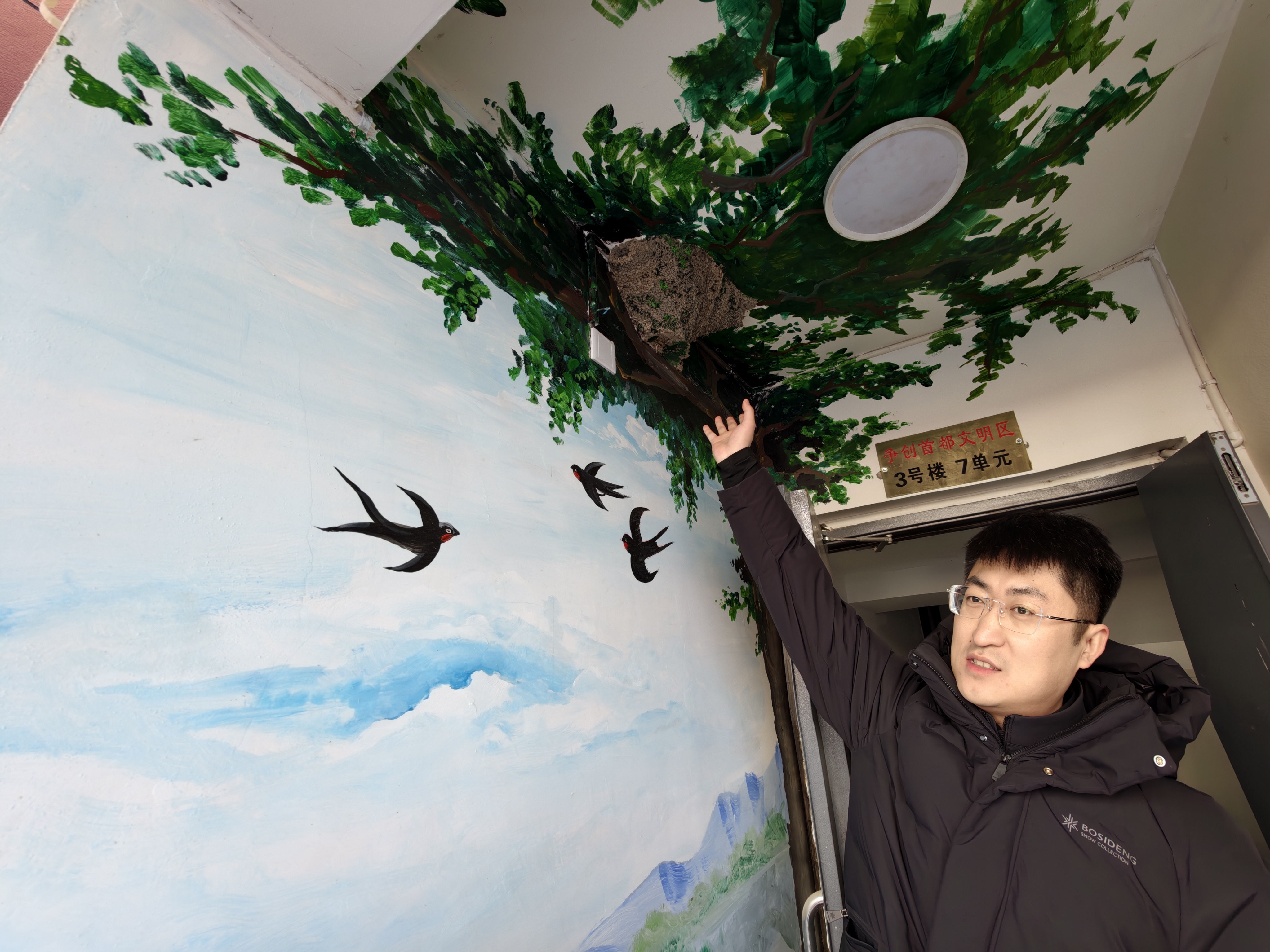 记者在走访时注意到,在6号楼与7号楼门上方,各有一个燕子窝。项目负责人告诉记者,这是小区改造前就存在的,每年春天燕子都会如期归来。“改造是‘焕新’,但不能断了这份自然的念想。”为此,施工时团队特意对这两个燕子窝做了细致的保护性防护,避免惊扰。更暖心的是,工人们随后在门洞墙面上创作了彩绘,绿意盎然的枝条间,几只燕子翩然飞舞,栩栩如生。彩绘与真实的燕子窝相映成趣,仿佛定格了春天燕子归来的美好景象,也将自然生态与百姓日常生活温馨地联系在一起。