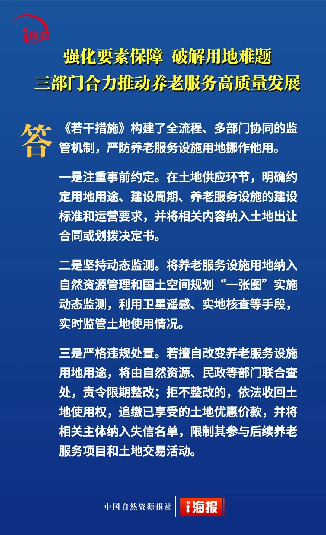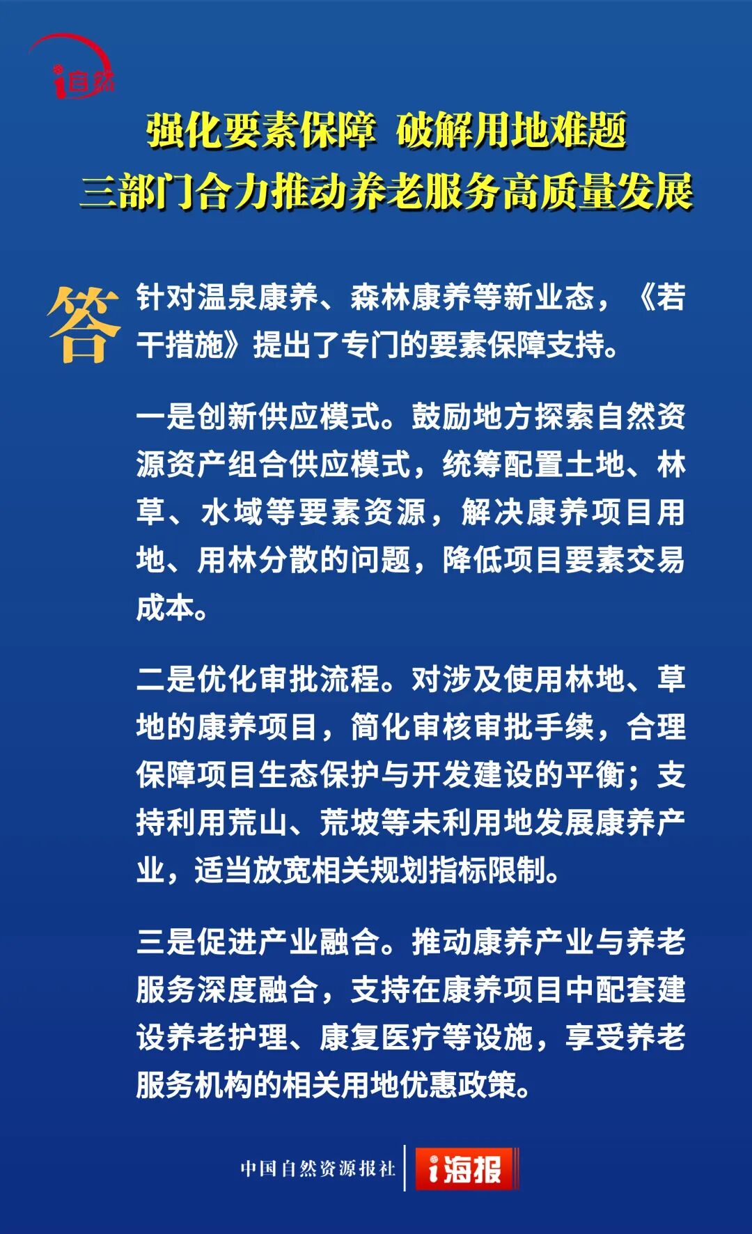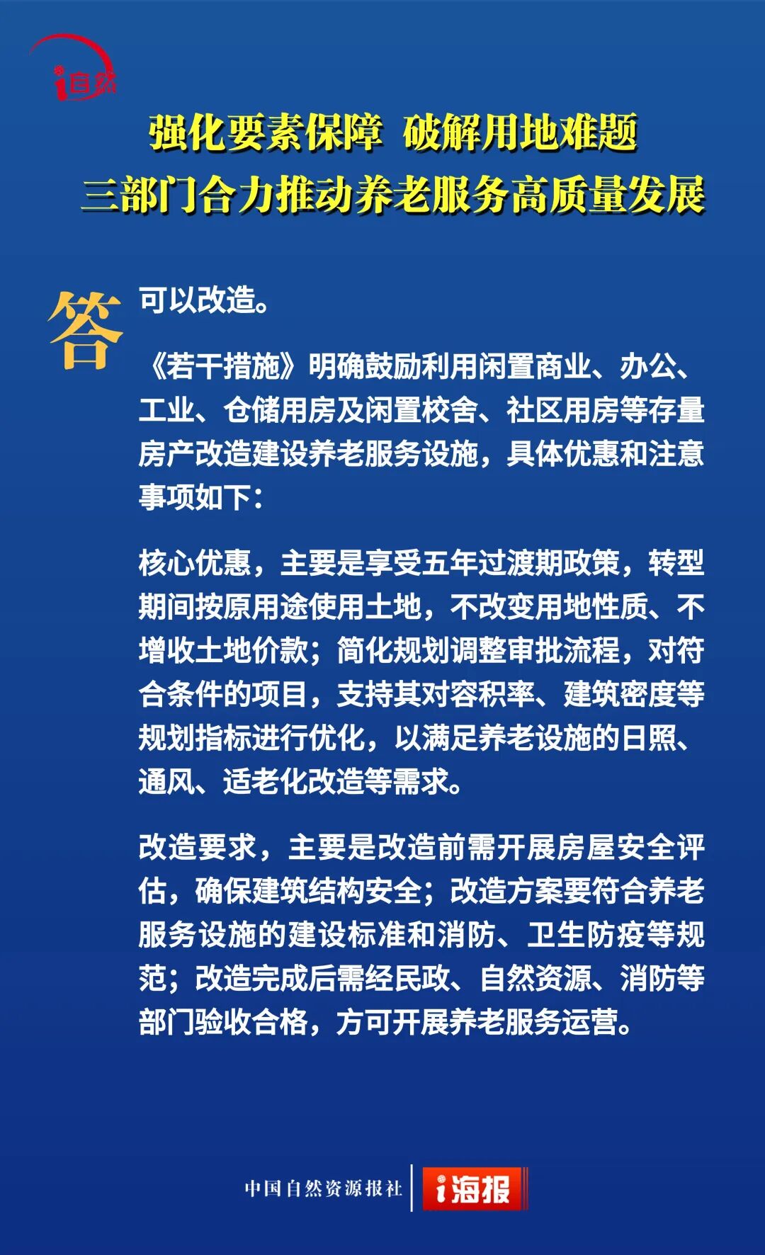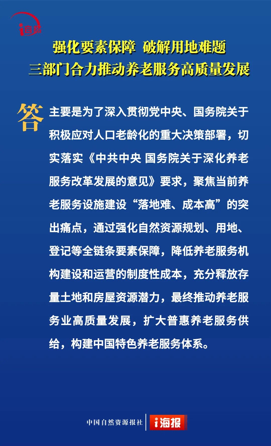 近日,自然资源部、民政部、国家卫生健康委联合印发《关于深化自然资源要素保障 支持养老服务改革发展的若干措施》,提出18条政策举措,降低用地成本、盘活利用存量空间、推动养老服务保障,从“基础兜底”向“提质增效、降负纾困”升级。今天10个问答带您全面了解。