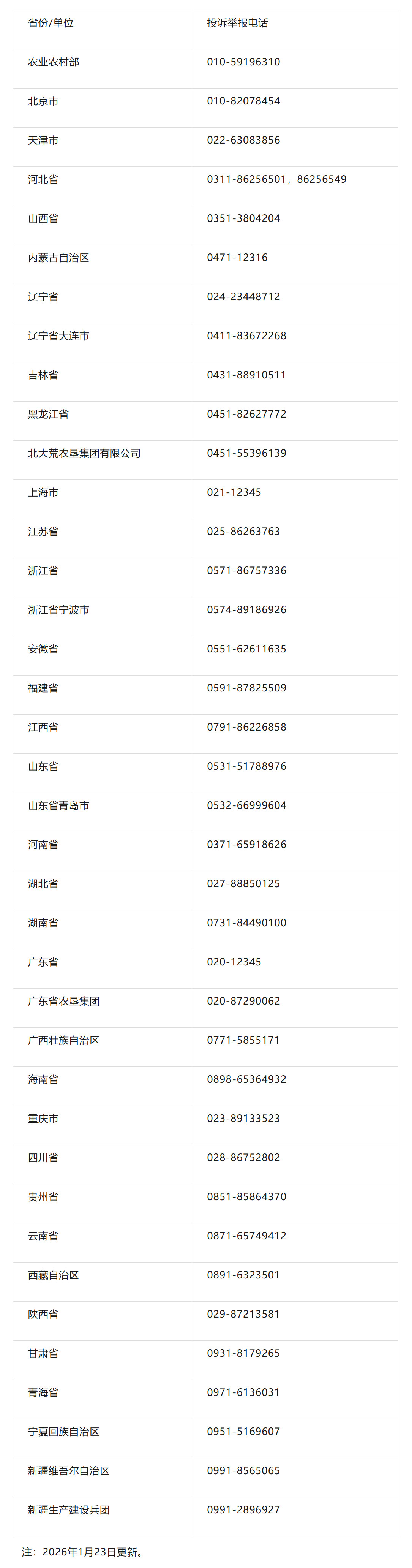 为扎实推进高标准农田建设工程质量“回头看”和专项整治行动,强化建设质量监管,畅通问题反映渠道,现将农业农村部、各省及相关地方高标准农田投诉举报电话公布如下,受理广大群众对高标准农田建设相关农田灌排设施、田间道路、电力设施等工程质量方面的问题投诉、建议和意见。