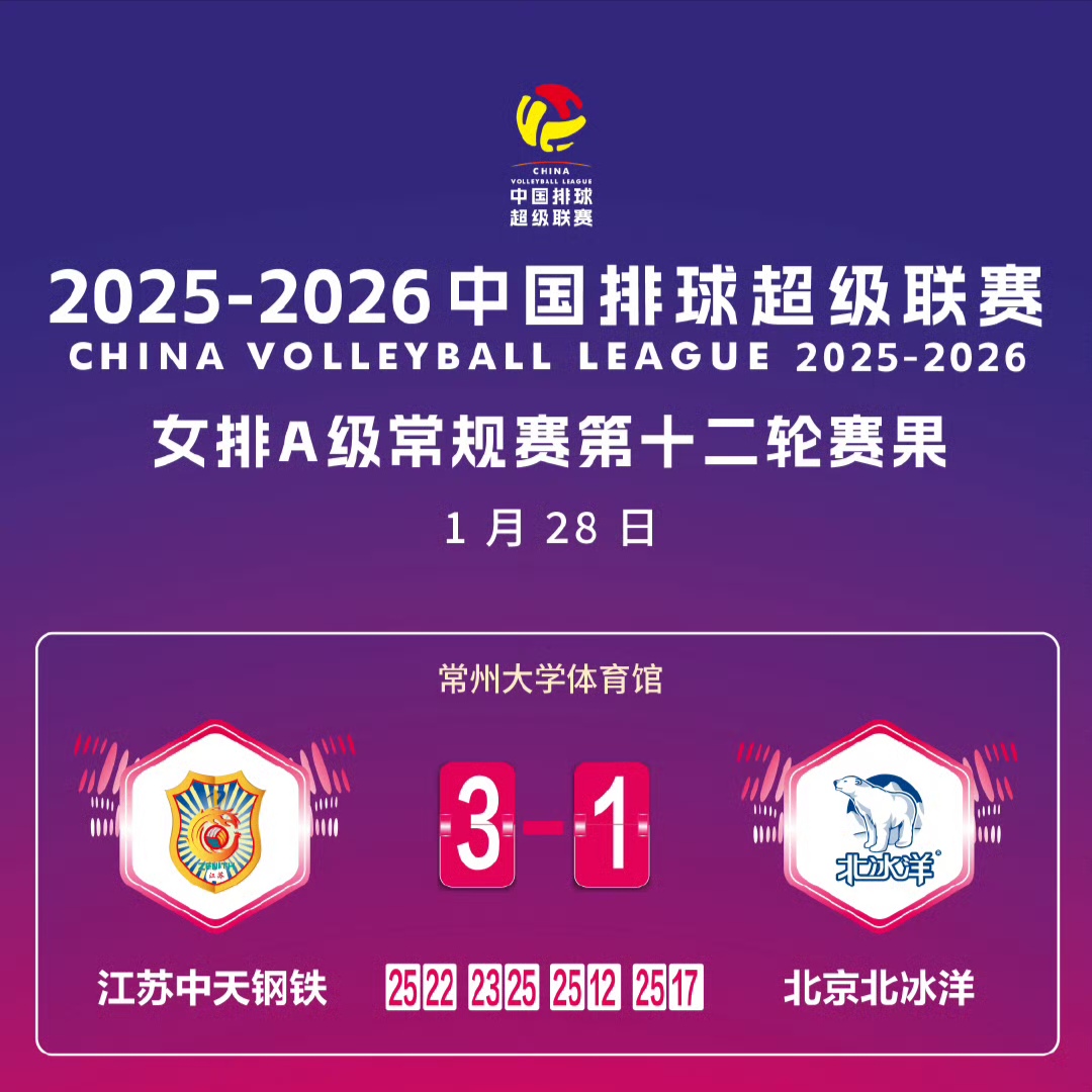 1月28日,中国排球超级联赛女排常规赛A级第12轮比赛,北京北汽女排客场挑战江苏女排。比赛后半段,北京女排自身一传出现松动,被对手抓住机会完成反击。最终,北京女排以1比3告负。