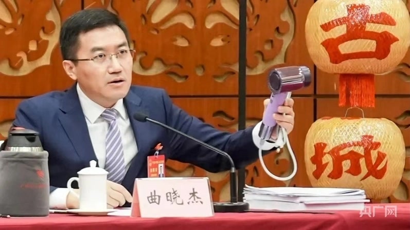 揭阳市市长曲晓杰推介揭阳产电吹风。“我试用过了,声音小,功能多,很好用!”他一边演示一边介绍,“头发养护的时候,可以把精油、养护油放进去,在吹发的过程中,你们就不用去焗油了”。