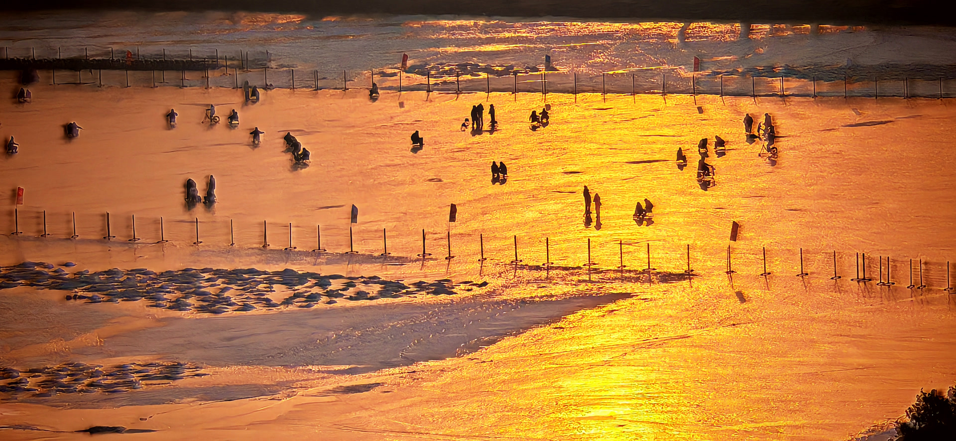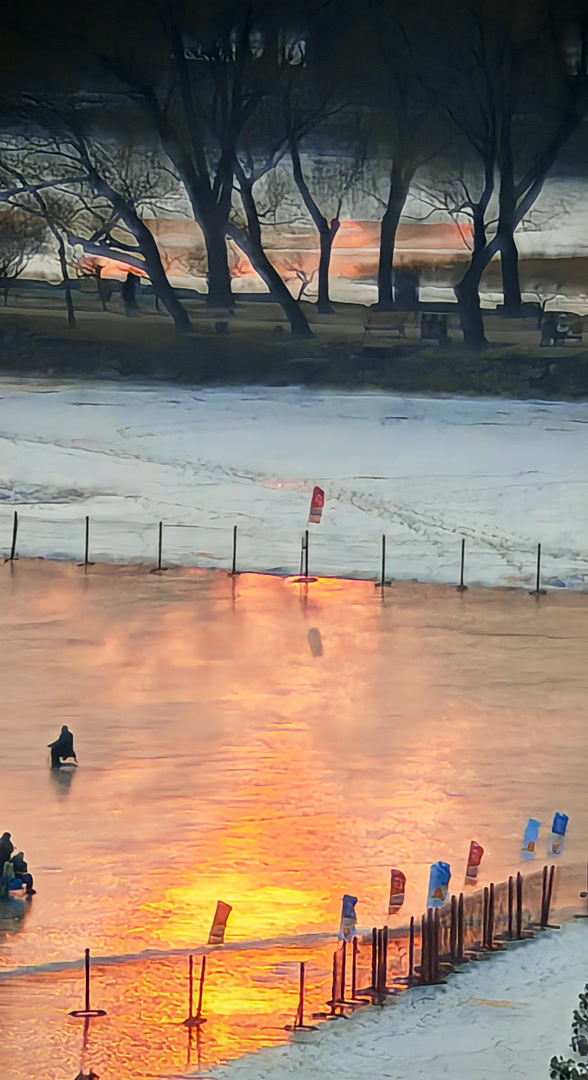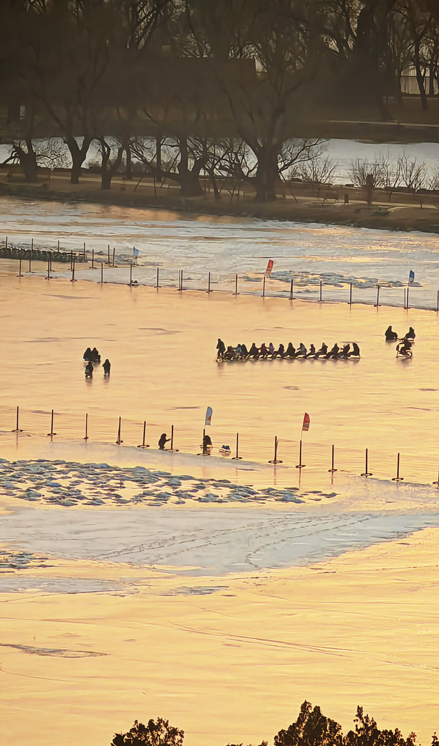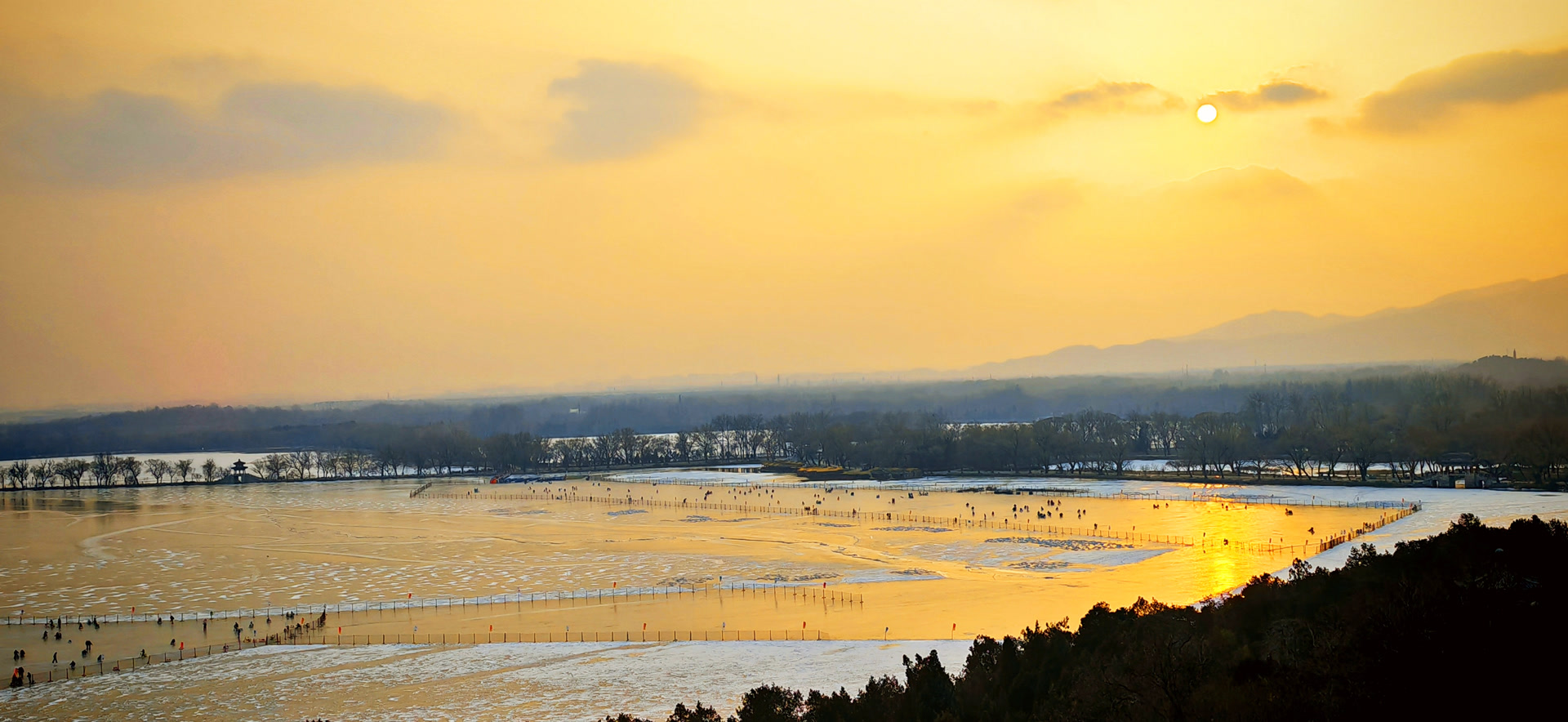 在佛香阁上凭栏观赏昆明湖,但见在夕阳映照下,近岸的薄冰犹如凝脂,泛着冷冷寒色,湖中心的冰层宛如巨大琥珀,折射出温润而深邃的光泽。而远山浅影、堤树疏枝,也都化作了画卷中淡墨写就的笔意。天、湖、山、亭,虚实交织,晕染出一幅充满呼吸的湖天画卷。